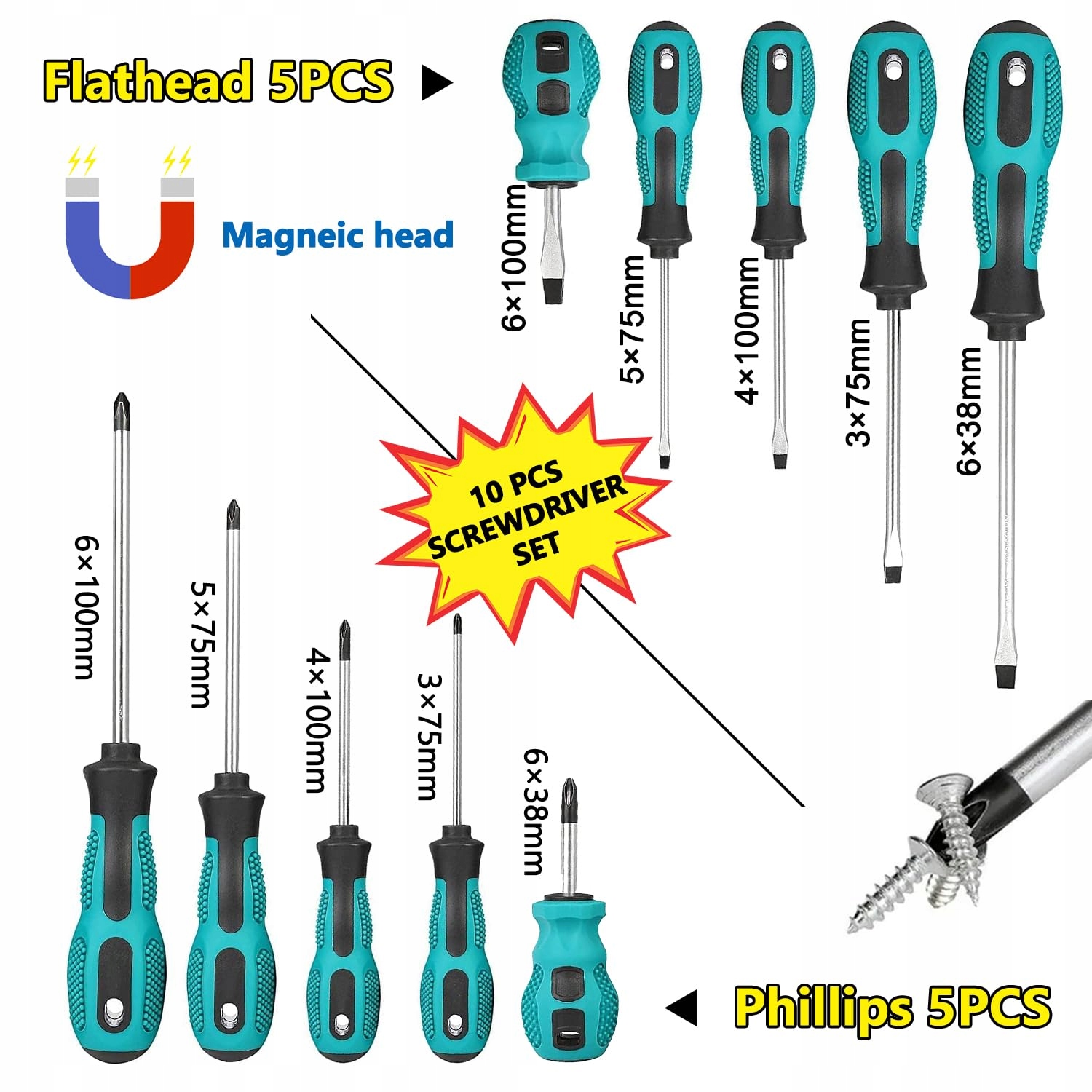 10-częściowy zestaw wkrętaków magnetycznych, wkrętak krzyżakowy, wkrętak płaski, wkrętak, zestaw wkrętaków - stal wanadowa z magnetycznymi końcówkami i ergonomiczną rączką