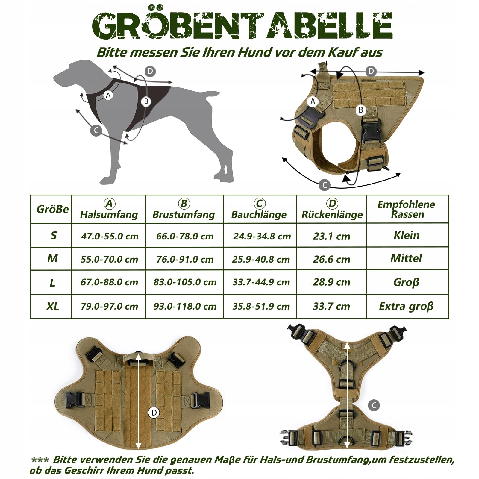 Ekstra duża kamizelka Molle dla psów, rozmiar: obwód szyi: 79 - 97 cm, obwód klatki piersiowej: 93 - 118 cm, długość pleców: 33,7 cm. Idealna dla dużych ras psów. Te codzienne szelki z dodatkowymi funkcjami łatwo dostosowują się do wszystkich codziennych wydarzeń i są teraz profesjonalną kamizelką dla psów pracujących w służbie, policji lub wojsku.