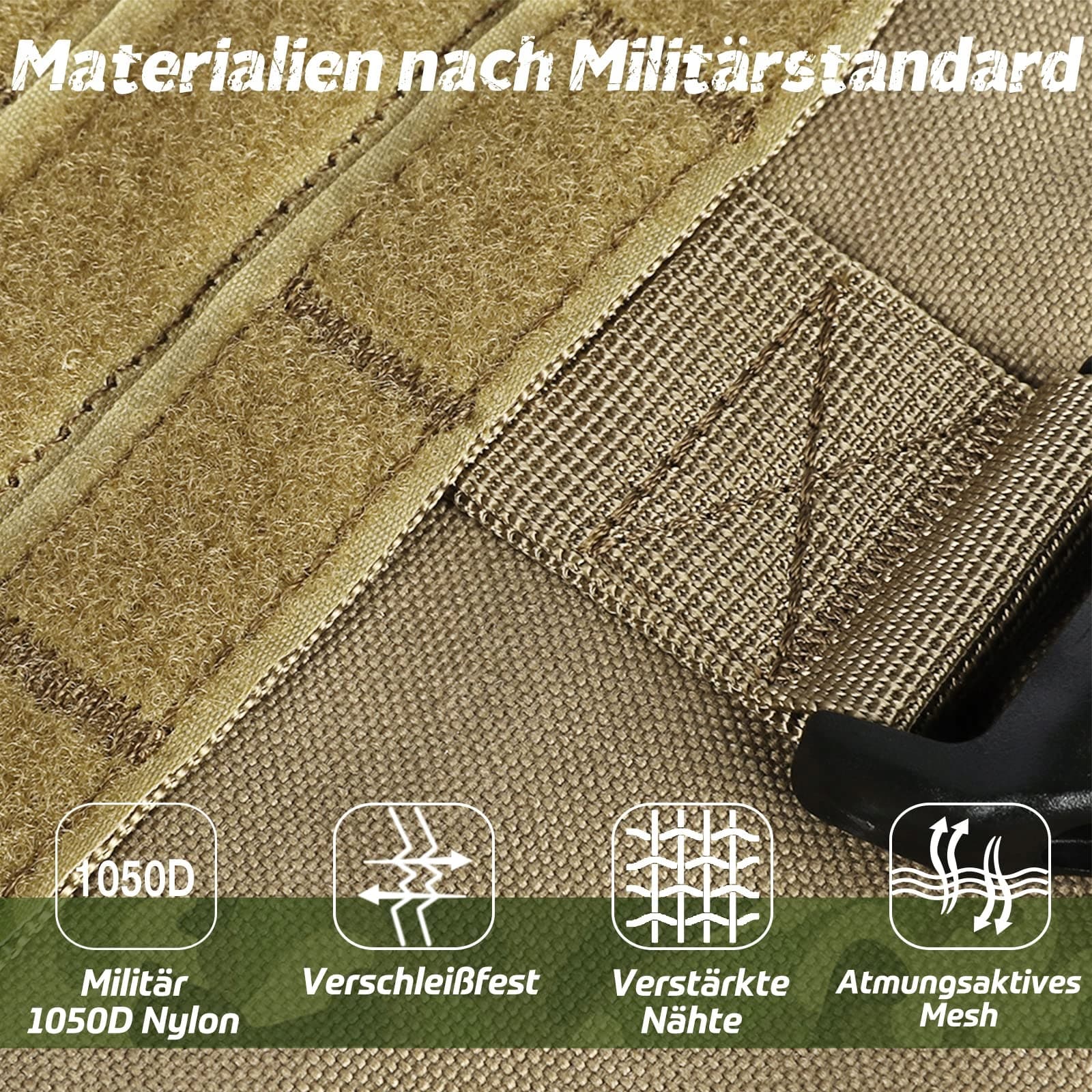 Materiał o standardzie wojskowym. Wytrzymała kamizelka z nylonu 1050D z solidnymi szwami dla dodatkowej trwałości i nośności, odpowiednia do wszystkich zastosowań. Dwie metalowe klamry na ramionach mogą wytrzymać duże siły ciągnące i zapewniają, że Twój pies jest bezpiecznie przypięty podczas treningu, polowania, pracy i innych okazji. Dobrze wyściełana w każdym punkcie nacisku, aby chronić skórę Twojego psa, podczas gdy oddychająca siatka zapewnia wentylację.
