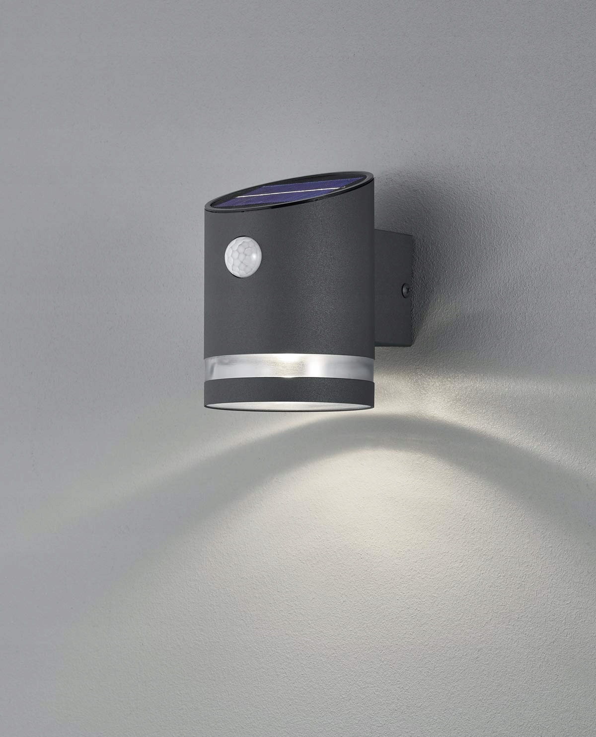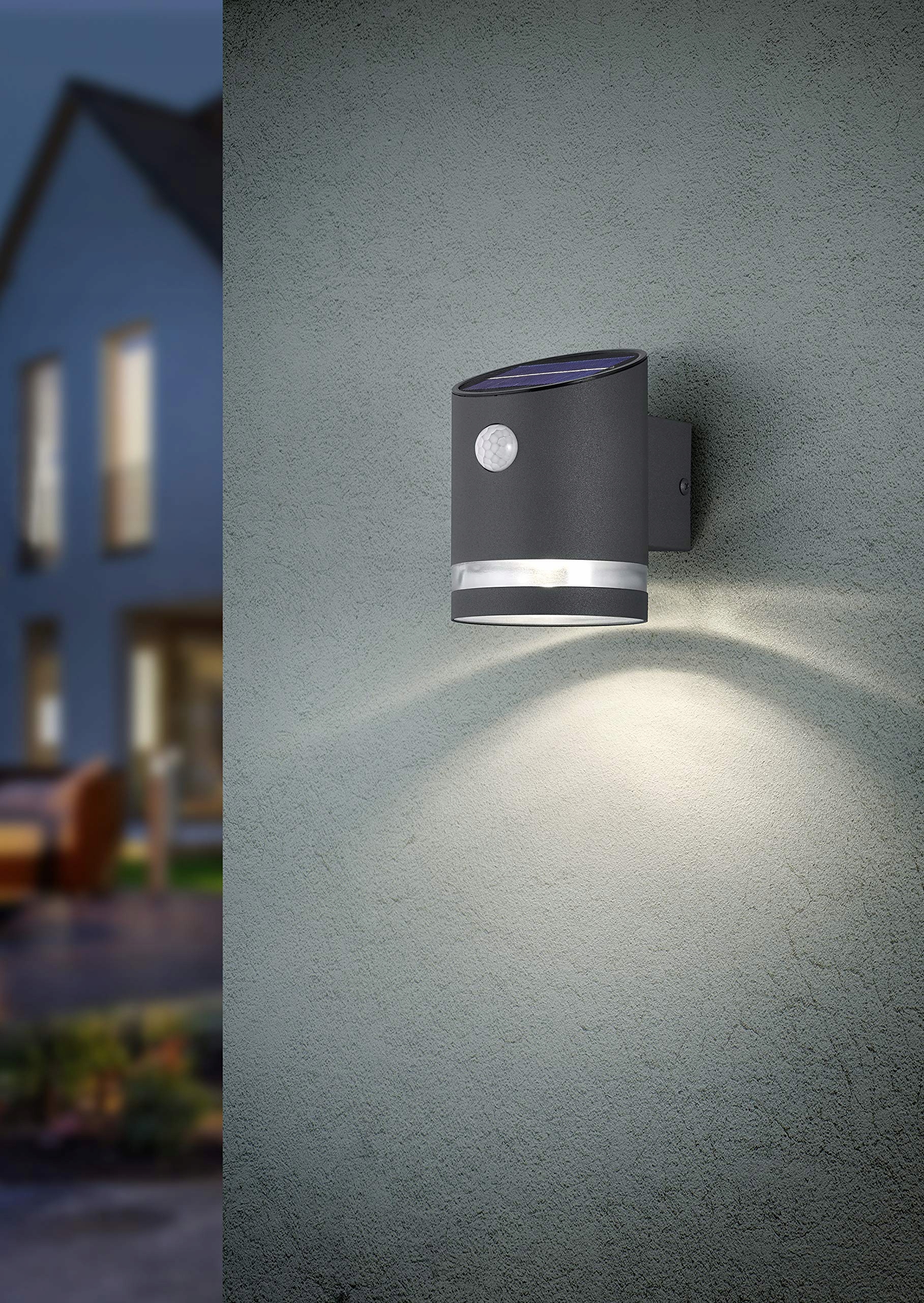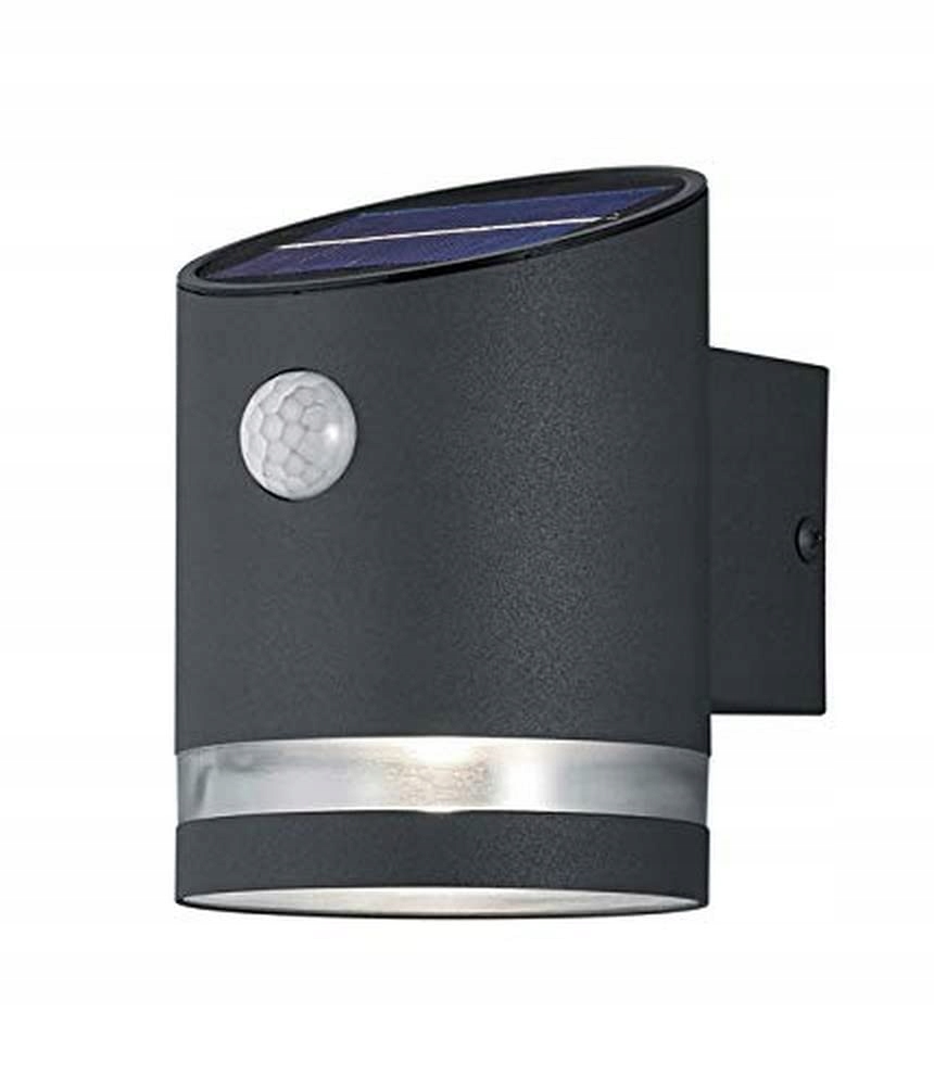 Solarna LED lampa ścienna zewnętrzna Salta w metalu antracytowym. Wbudowany czujnik ruchu ma zasięg od 6 do 8 metrów przy 90°