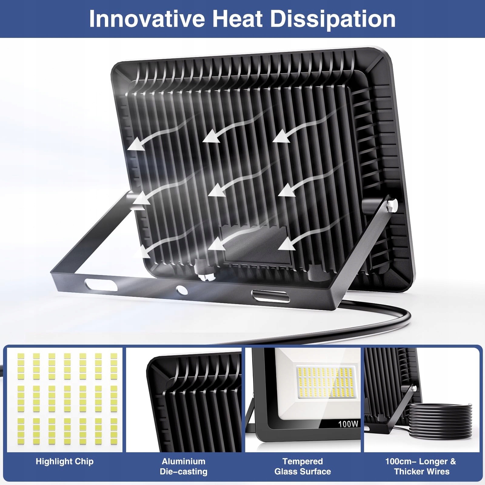 ☀️[Trwałość wodoodporna IP65] Reflektor zewnętrzny LED ma wodoodporność IP65 i jest wewnętrznie wyposażony w wodoodporny silikonowy pierścień, który może normalnie działać w różnych trudnych warunkach pogodowych, takich jak deszcz, grad, śnieg, upał, kurz i mgła. Cała lampa LED przyjmuje strukturę odlewu ciśnieniowego z aluminium, a struktura odprowadzania ciepła w kształcie płetwy rekina jest wystarczająca, efektywniejsza i szybsza w odprowadzaniu ciepła