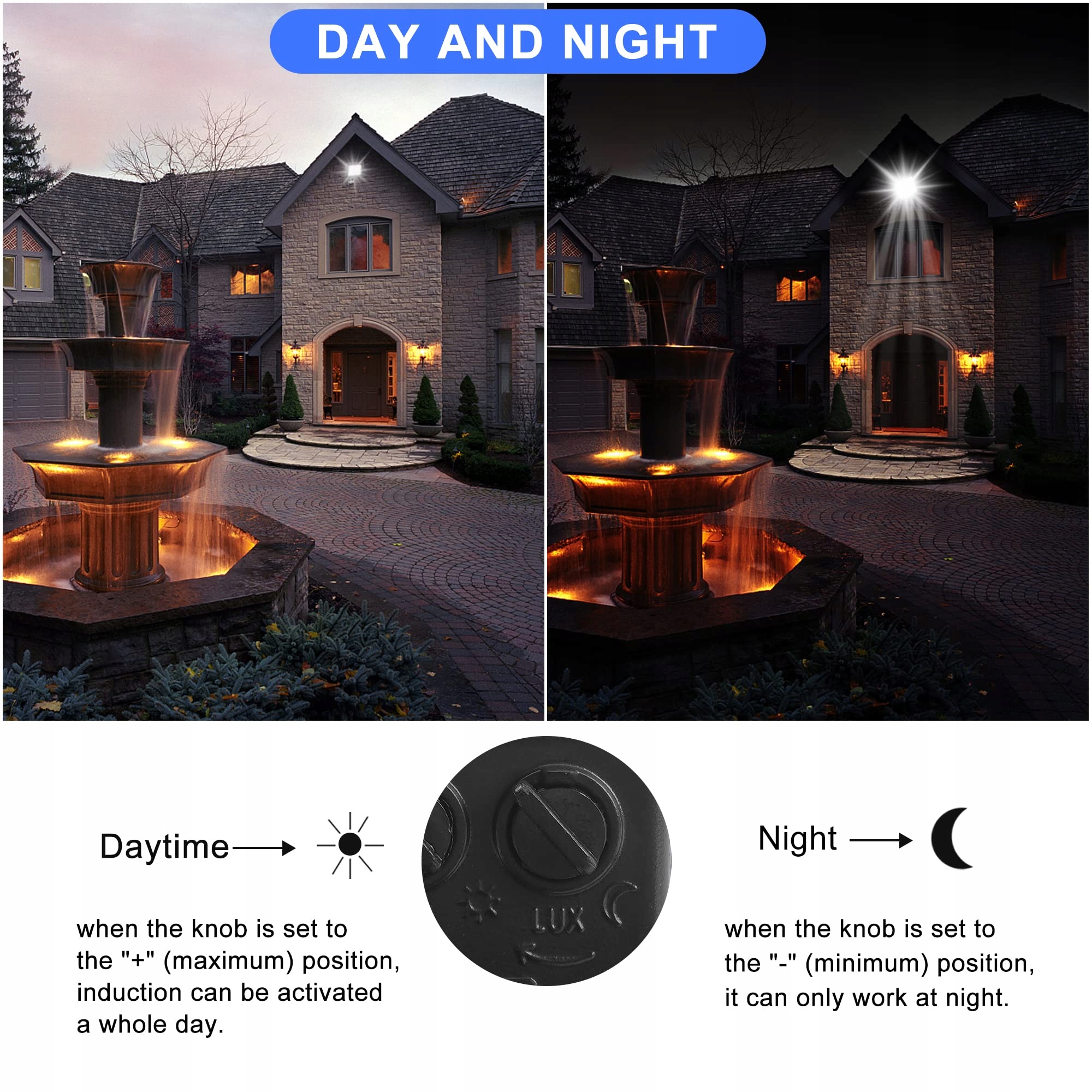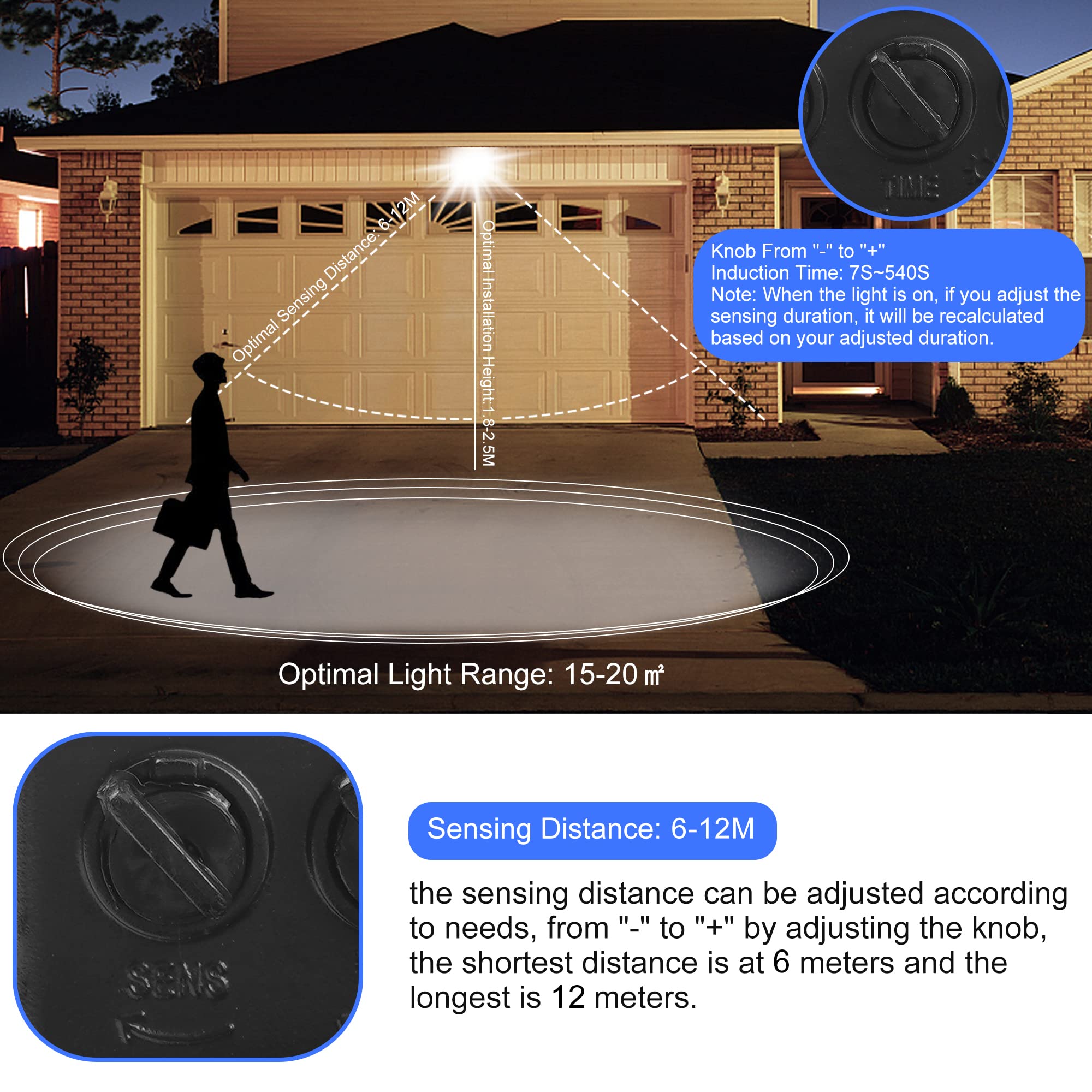 [Reflektor LED z 3 trybami ustawień] Reflektor LED posiada tryb TIME, tryb SENS i tryb LUX, co pozwala na szybsze i dokładniejsze ustawienie reflektora LED. Trzy ogólne tryby oświetlenia (7s-9min), zakres wykrywania (6-12m) i czułość (dzień i noc) są regulowane. Doskonała funkcja wykrywania zapewnia efektywną pracę jednocześnie redukując niepotrzebne zużycie energii.
