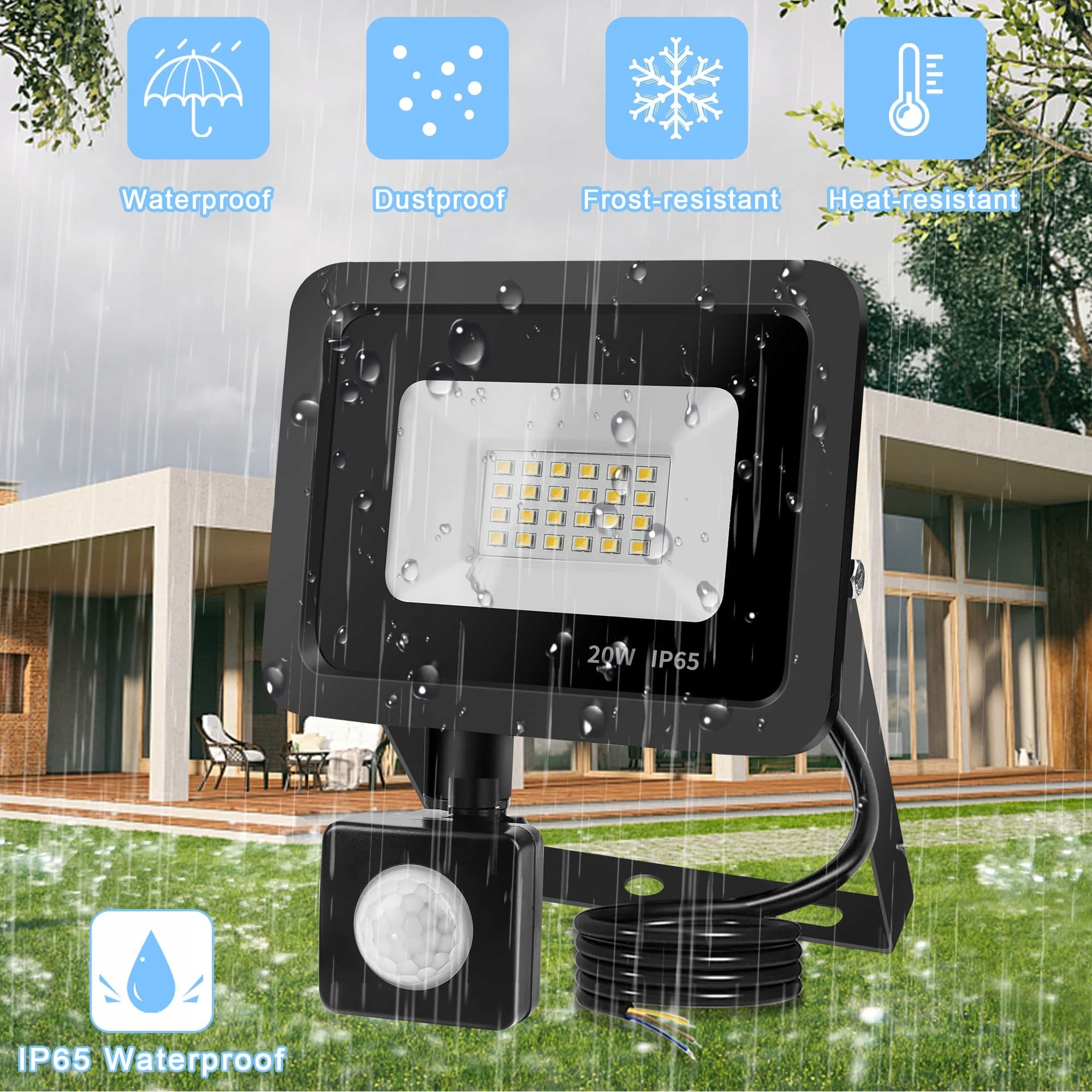 [Wodoodporny i trwały] Reflektor LED Realky z czujnikiem ruchu na zewnątrz wykonany jest z odpornego na uderzenia materiału stopu aluminium, co zapewnia lepsze odprowadzanie ciepła, wydłuża żywotność żarówki i jest bezpieczniejszy. Uszczelnienie IP65 działa również doskonale w ekstremalnych warunkach pogodowych, takich jak burze czy gorąca pogoda. Reflektory z czujnikiem ruchu na zewnątrz są doskonałe do akcentowego oświetlenia na zewnątrz i nadają się również do oświetlenia ścian domów.