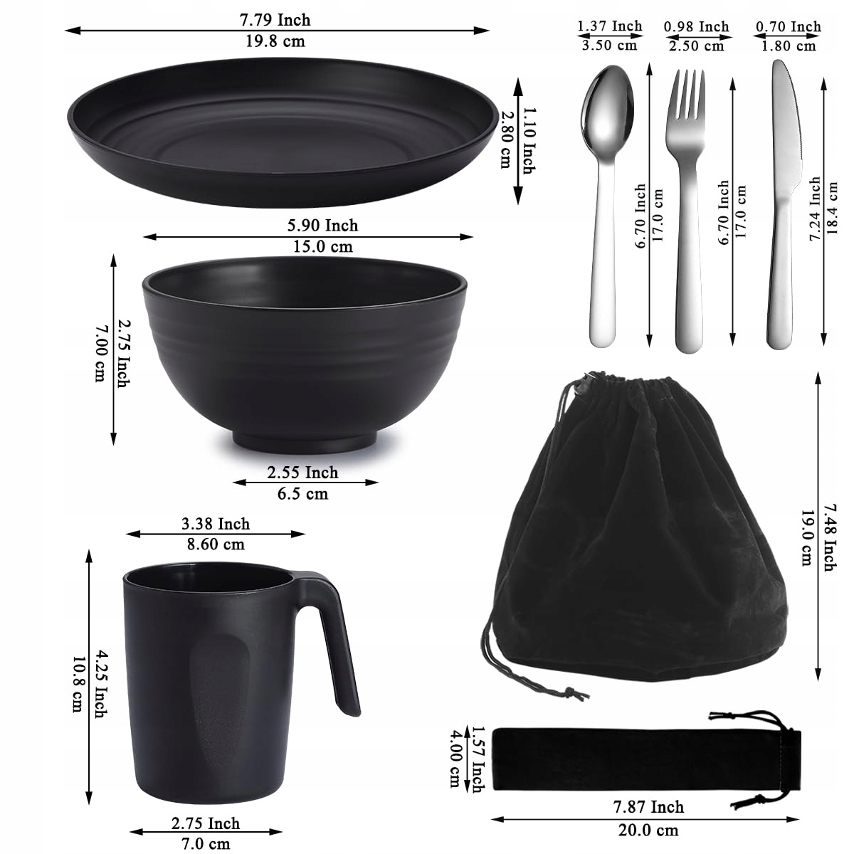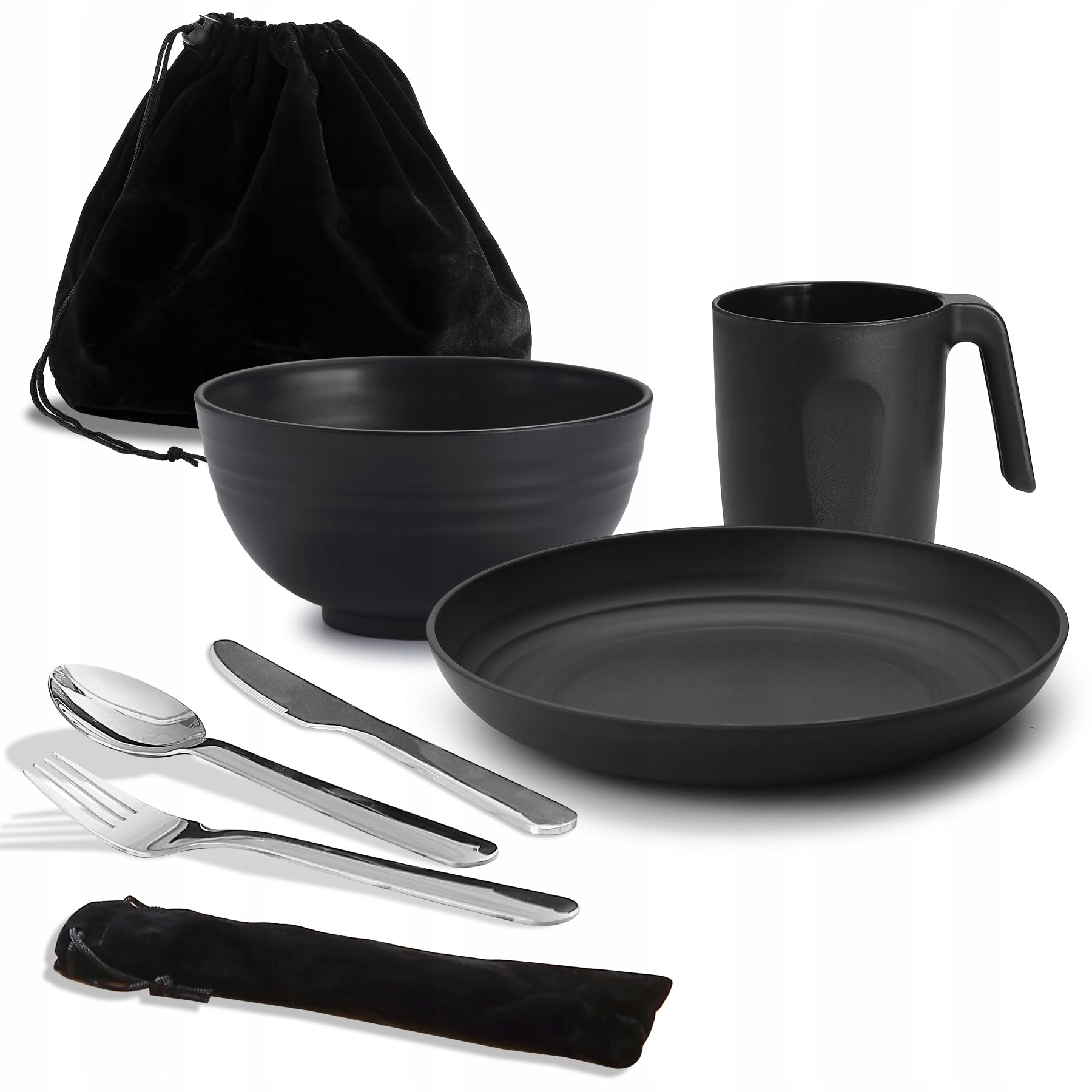 EKONOMICZNY ZESTAW: Otrzymujesz piękny zestaw sztućców, który zawiera 1 duży talerz, 1 miskę, 1 kubek o dużej pojemności oraz 1 zestaw sztućców ze stali nierdzewnej, w skład którego wchodzą nóż, widelec i łyżka.