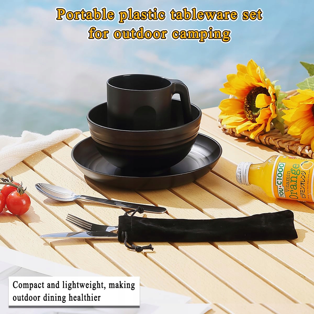 WYSOKA JAKOŚĆ: Talerze i kubki w tym zestawie kempingowym wykonane są z materiału PP. Są lekkie, niezniszczalne i wytrzymałe, sztućce ze stali nierdzewnej wykonane są z wysokiej jakości stali nierdzewnej, solidne i trwałe.