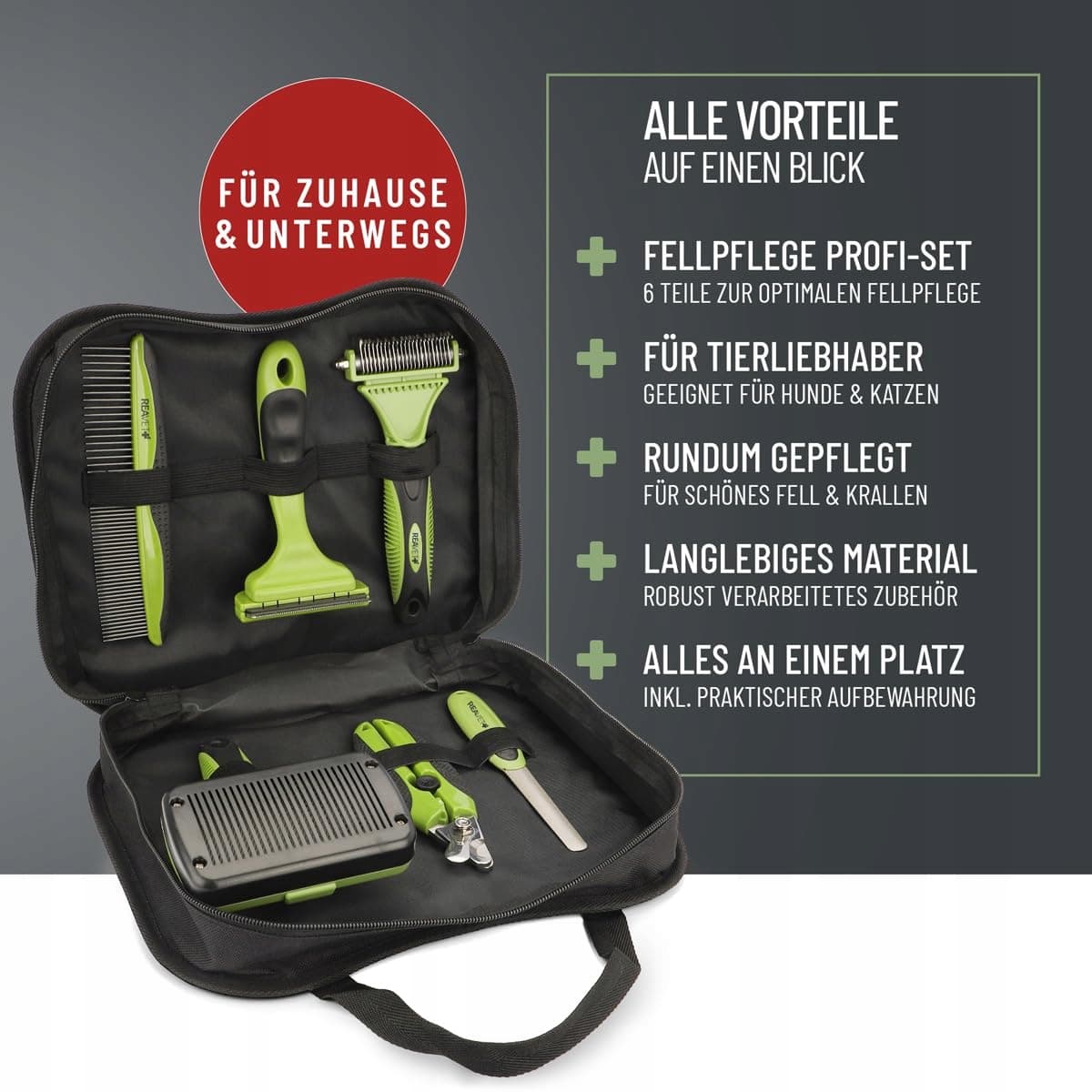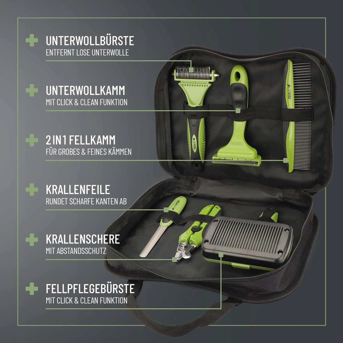 ReaVET Profesjonalny Zestaw do Pielęgnacji Sierści dla Psów i Kotów I Zestaw Pielęgnacyjny 6-częściowy I Szczotka dla Psów, Szczotka do Rozczesywania, Szczotka do Podszerstka, Grzebień na Pchły, Obcinacz do Pazurów i Torba Pielęgnacyjna
