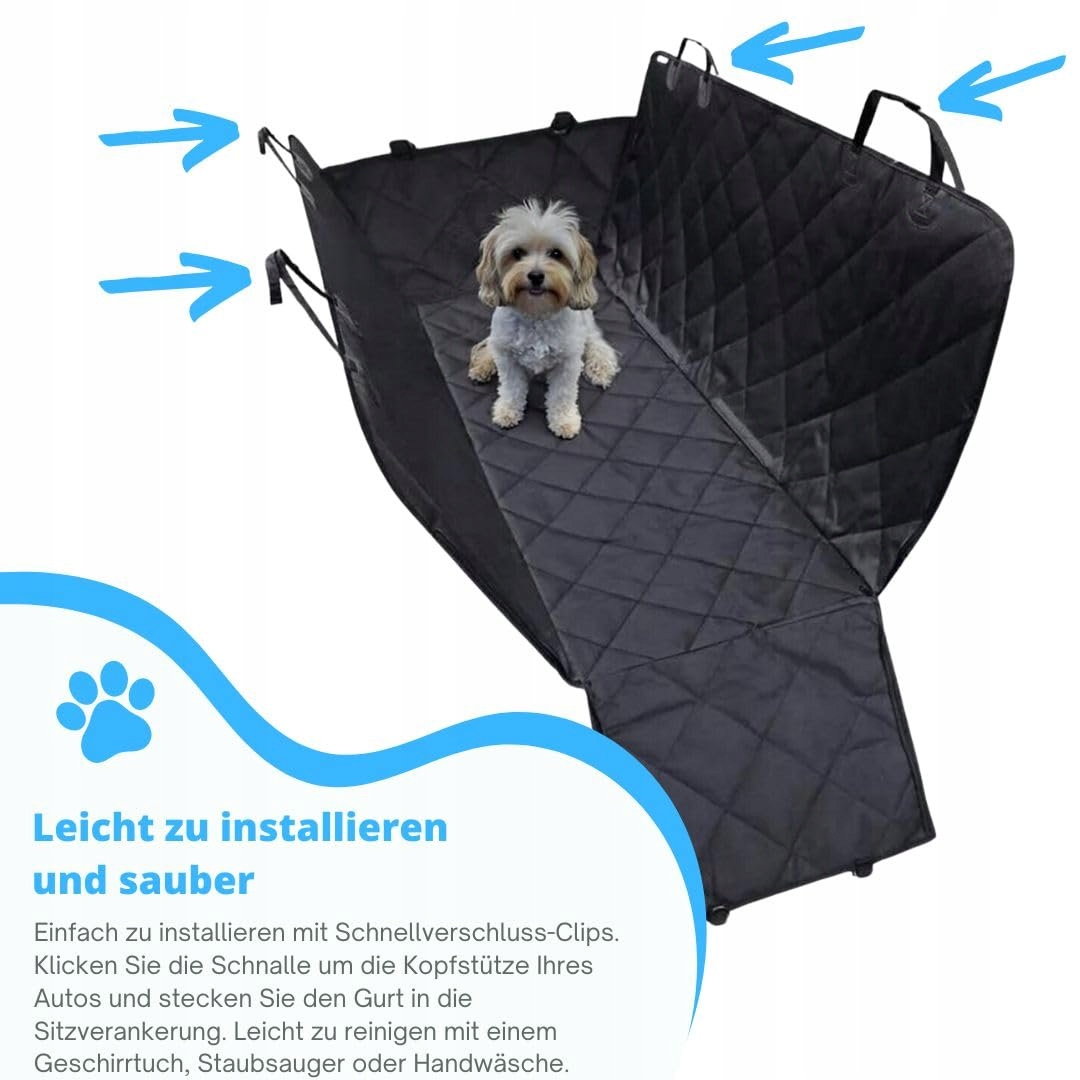 [BEZPIECZEŃSTWO NA PIERWSZYM MIEJSCU] - Dzięki dołączonym klipsom i szybkozłączkom skrzynka transportowa dla psa jest szybko i bezpiecznie przymocowana. Mata ochronna do samochodu dla psa jest przymocowana do czterech zagłówków i przez otwory na pasy w siedzeniach. Jest zabezpieczona w sześciu miejscach. Zapobiega to przesuwaniu się psa. Dzięki dołączonym pasom możesz zabezpieczyć swojego zwierzaka.
