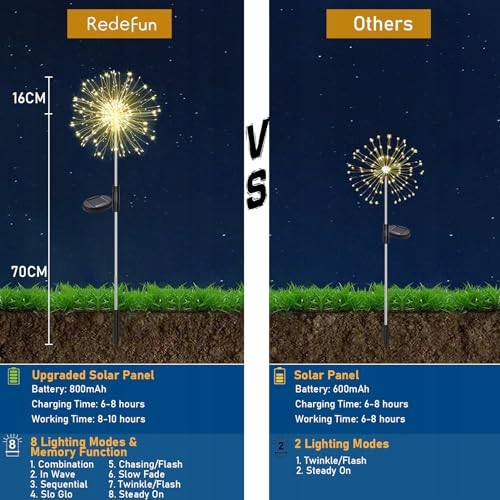 [Wysoka elastyczność i szerokie zastosowanie] Solarne lampy ogrodowe Redefun składają się z 120 ulepszonych diod LED i 60 nici wysokoelastycznych miedzianych drutów, które można łatwo wygiąć w dowolny kształt, taki jak kwiaty, fajerwerki, serce. Idealne do dekoracji skrzynek balkonowych, tarasów, ścieżek itp. Lampy solarne tworzą świąteczną i romantyczną atmosferę!