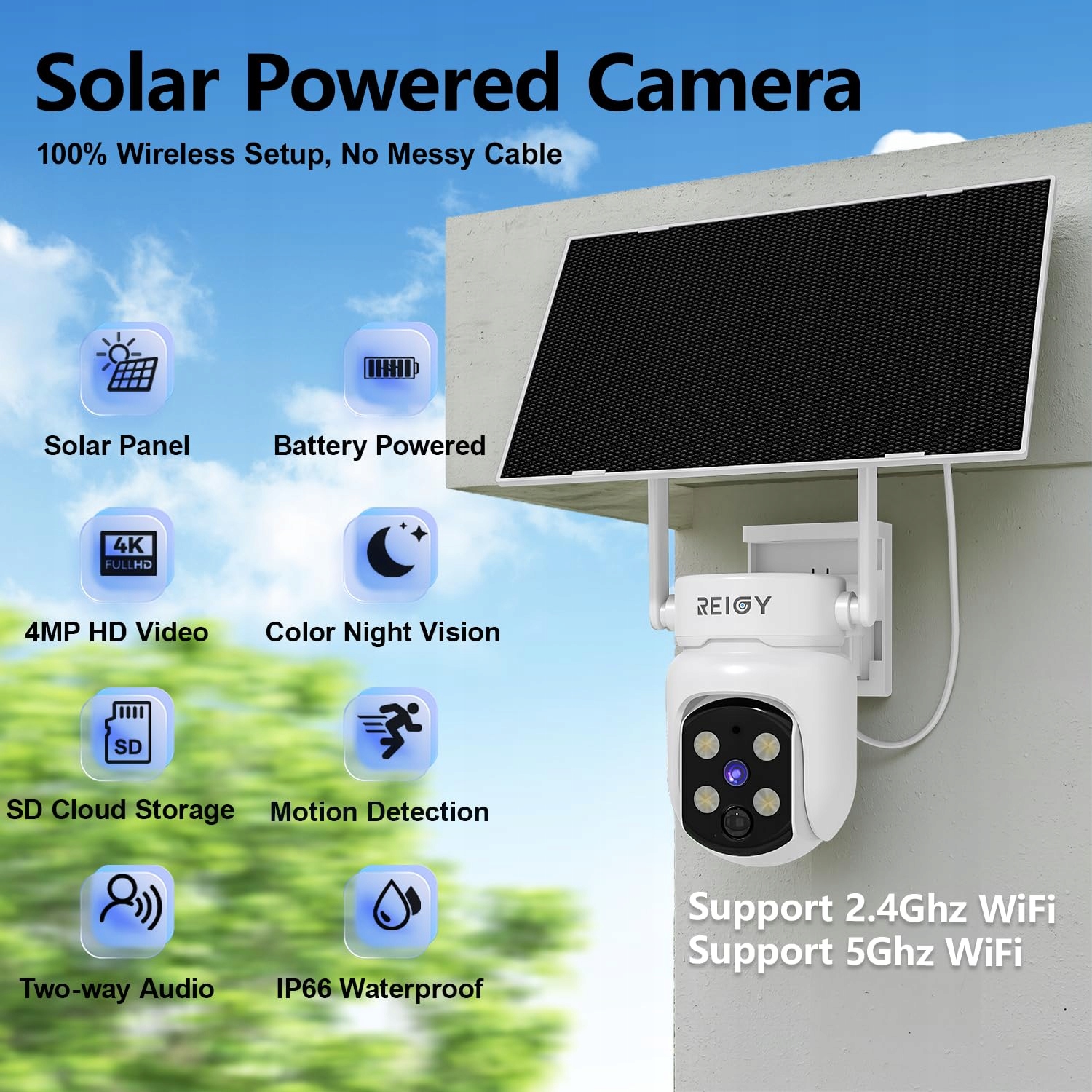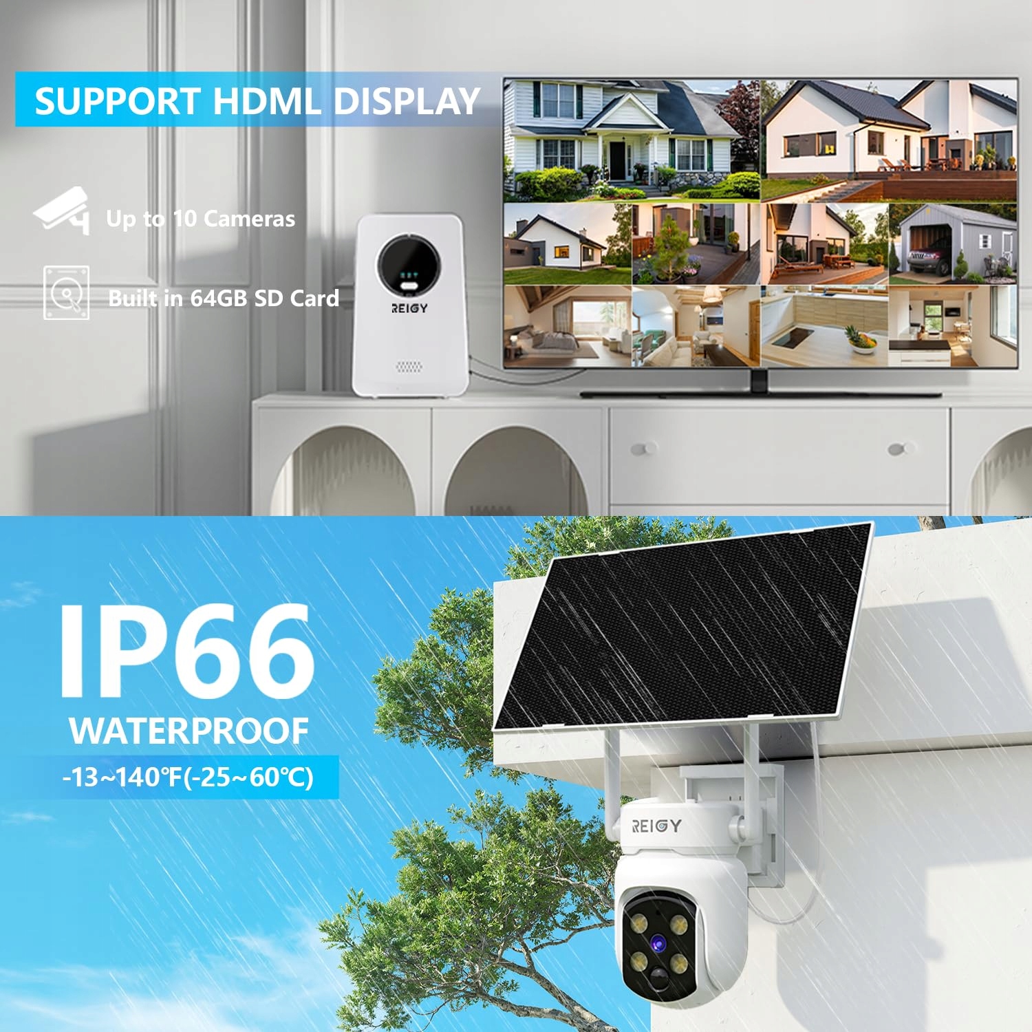 【10-kanałowy system bezpieczeństwa, możliwość dodania kolejnych 8 kamer】Jeden system monitoruje cały dom. Jedna aplikacja spełnia wszystkie Twoje potrzeby monitoringu. System REIGY obejmuje kamery wewnętrzne, zewnętrzne, na baterie i PTZ. Możesz wybrać kamerę według różnych scenariuszy i dodać ją do systemu NVR REIGY. Uwaga: ta kamera solarna nagrywa zdarzenia po wykryciu ruchu. Jeśli potrzebujesz kamery z nagrywaniem 24/7, wybierz proszę kamerę z zasilaczem.