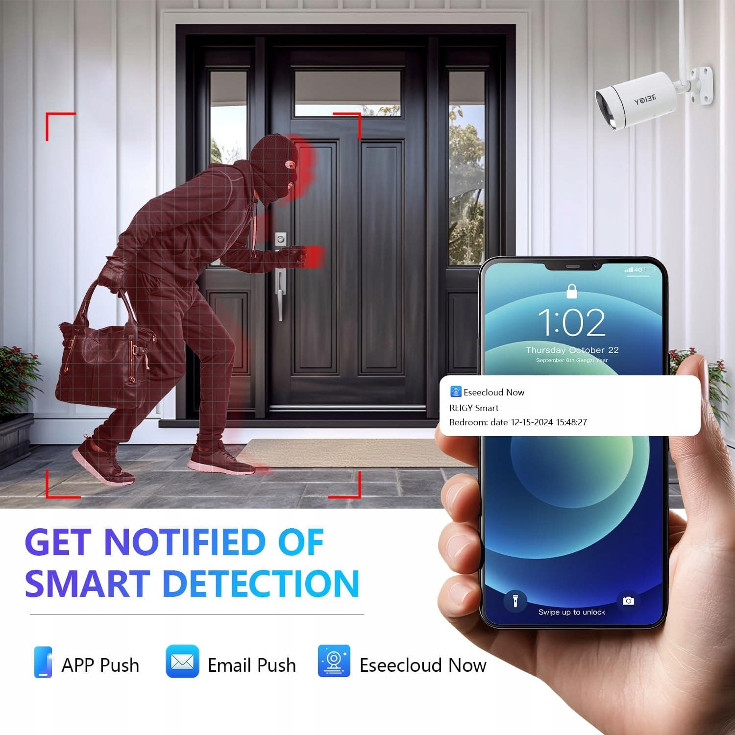【Alarm świetlny i dźwiękowy】Możesz ustawić zestaw kamer zewnętrznych tak, aby wydawał głośny sygnał alarmowy lub migające światło LED, aby odstraszyć intruzów lub niechciane małe zwierzęta. Kamera zewnętrzna może automatycznie włączyć dźwięk lub światło, gdy zostanie wykryty ruch. Jednocześnie nasz system Reigy wyśle Ci powiadomienie przez aplikację i e-mail, że ktoś znajduje się w Twoim domu.