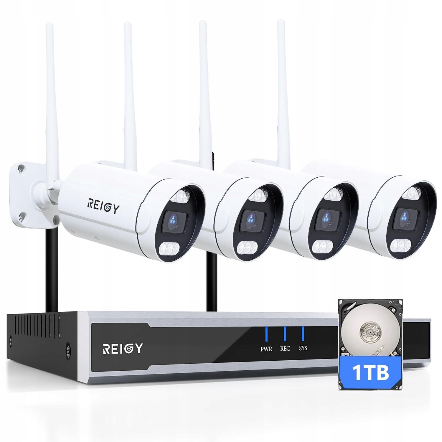 REIGY 5MP WLAN Zestaw kamer do monitoringu zewnętrznego z dyskiem 1TB, 16CH WiFi NVR system monitoringu +4x1920P kamera, dwukierunkowe audio, wykrywanie ruchu, kolorowe widzenie nocne