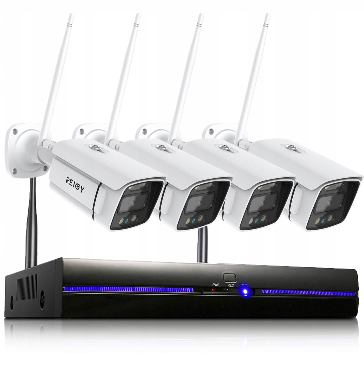 REIGY 3MP WLAN Zestaw kamer do monitoringu zewnętrznego z reflektorem, 10CH bezprzewodowy system NVR +4x1296P kamera bezprzewodowa, dwukierunkowe audio, wykrywanie ruchu, kolorowa noktowizja, bez dysku twardego