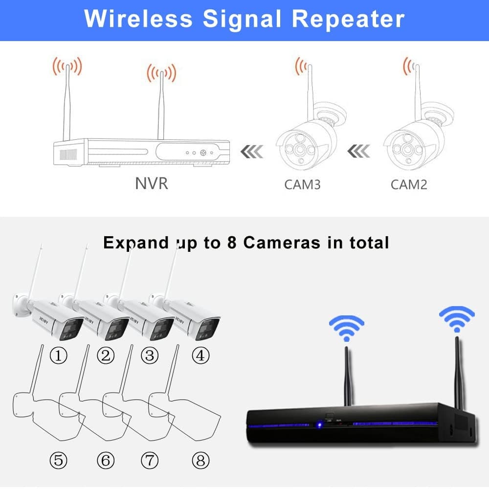 【3MP zestaw kamer WLAN i kolorowa noktowizja】Ta kamera oferuje wysokiej jakości wideo i zdjęcia 3MP, które można oglądać zdalnie w czasie rzeczywistym za pomocą aplikacji mobilnej Eseecloud. Trzy tryby noktowizji: tryb podczerwieni, tryb reflektora, tryb inteligentny, światło IR lub reflektor włącza się automatycznie przy słabym oświetleniu, aby zapewnić widoczność w ciemności.