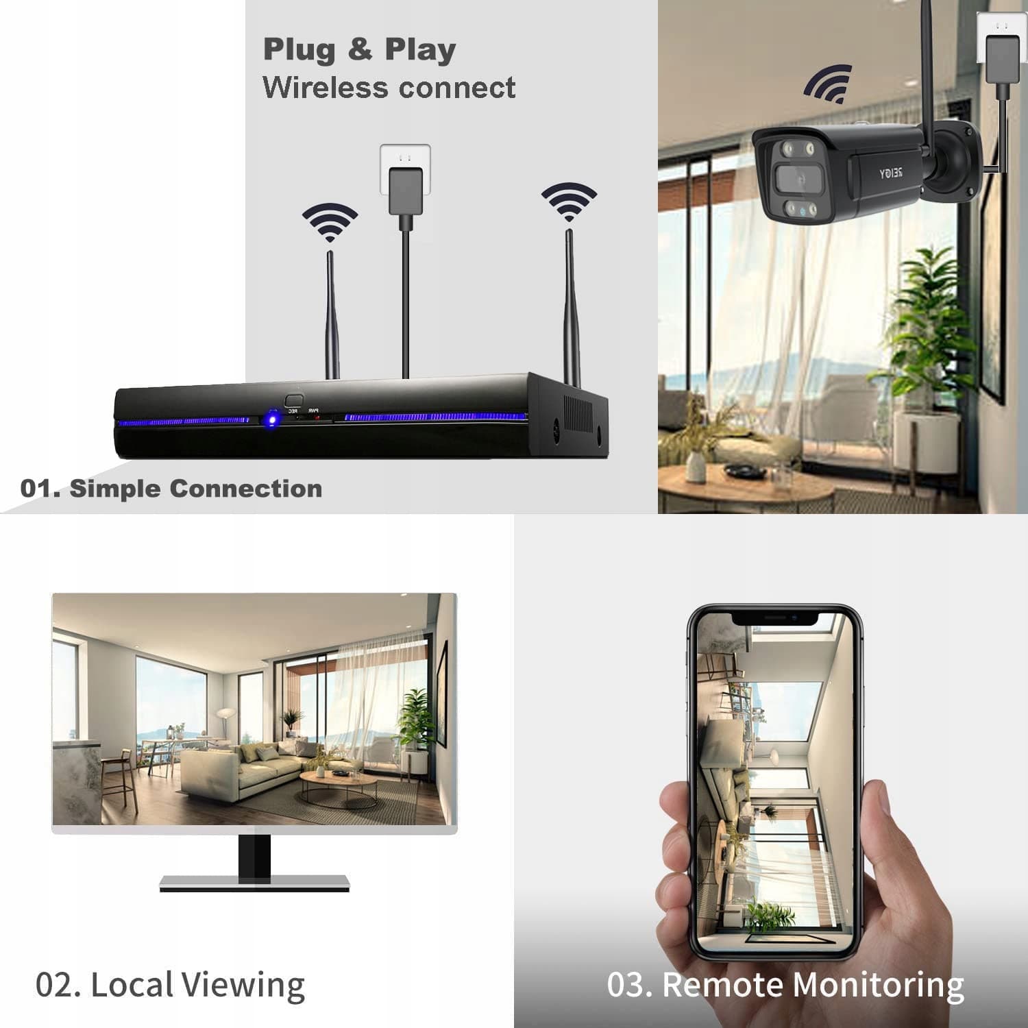 【Połączenie z IOS, Android, Windows】Ten bezprzewodowy system monitoringu obsługuje zdalny podgląd w aplikacji Eseecloud (iOS i Android) lub na komputerze (Windows). Konfiguracja jest bardzo prosta, wystarczy zeskanować kod QR. (Uwaga: te kamery zewnętrzne działają tylko z siecią Wi-Fi 2,4 GHz, mogą nie działać z 5 GHz).
