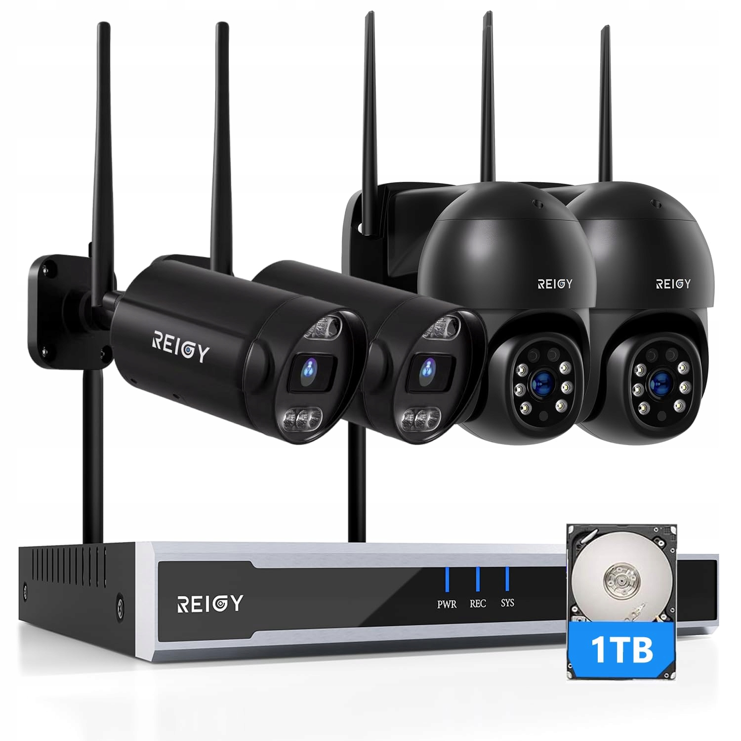 REIGY 8MP WLAN Zestaw zewnętrznych kamer monitoringu z wstępnie zainstalowanym dyskiem 1TB, bezprzewodowy system nadzoru 16CH NVR z 2xPT+2xBullet kamerą, zestaw kamer zewnętrznych, z dwukierunkowym audio i detekcją ruchu