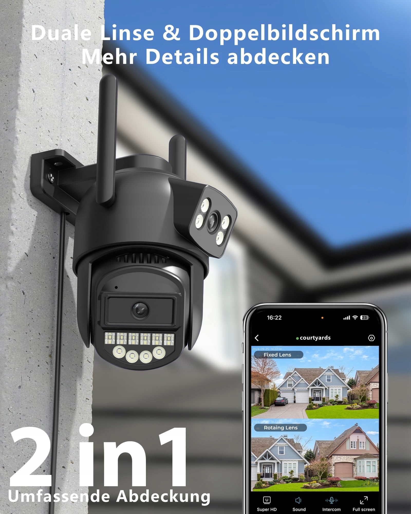 Reobiux Kamera monitoringu zewnętrznego, z podwójnym obiektywem 6MP, 2.4/5Ghz WLAN, kamera monitoringu zewnętrznego, 360° PTZ, Ethernet, kolorowy tryb nocny, dwukierunkowe audio, alarm syrenowy, kabel do garażu/ogrodu/drzwi wejściowych, IP66