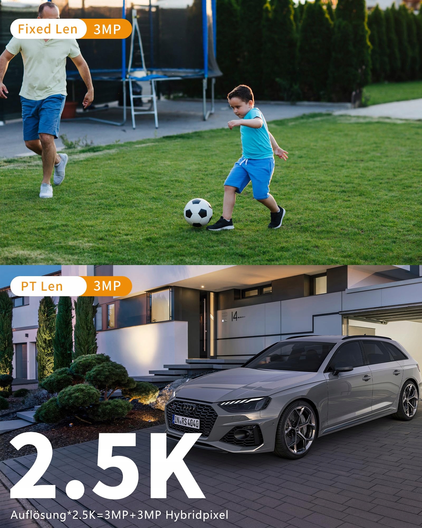 【Podwójny obiektyw i 5x zoom】 Kamera monitoringu zewnętrznego posiada konstrukcję PTZ z podwójnym obiektywem, obsługuje obrót o 360°. Pokrywa w pełni domy, sklepy, garaże i podwórka oraz precyzyjnie rejestruje poruszające się cele, zapewniając bezprzerwowy system monitoringu