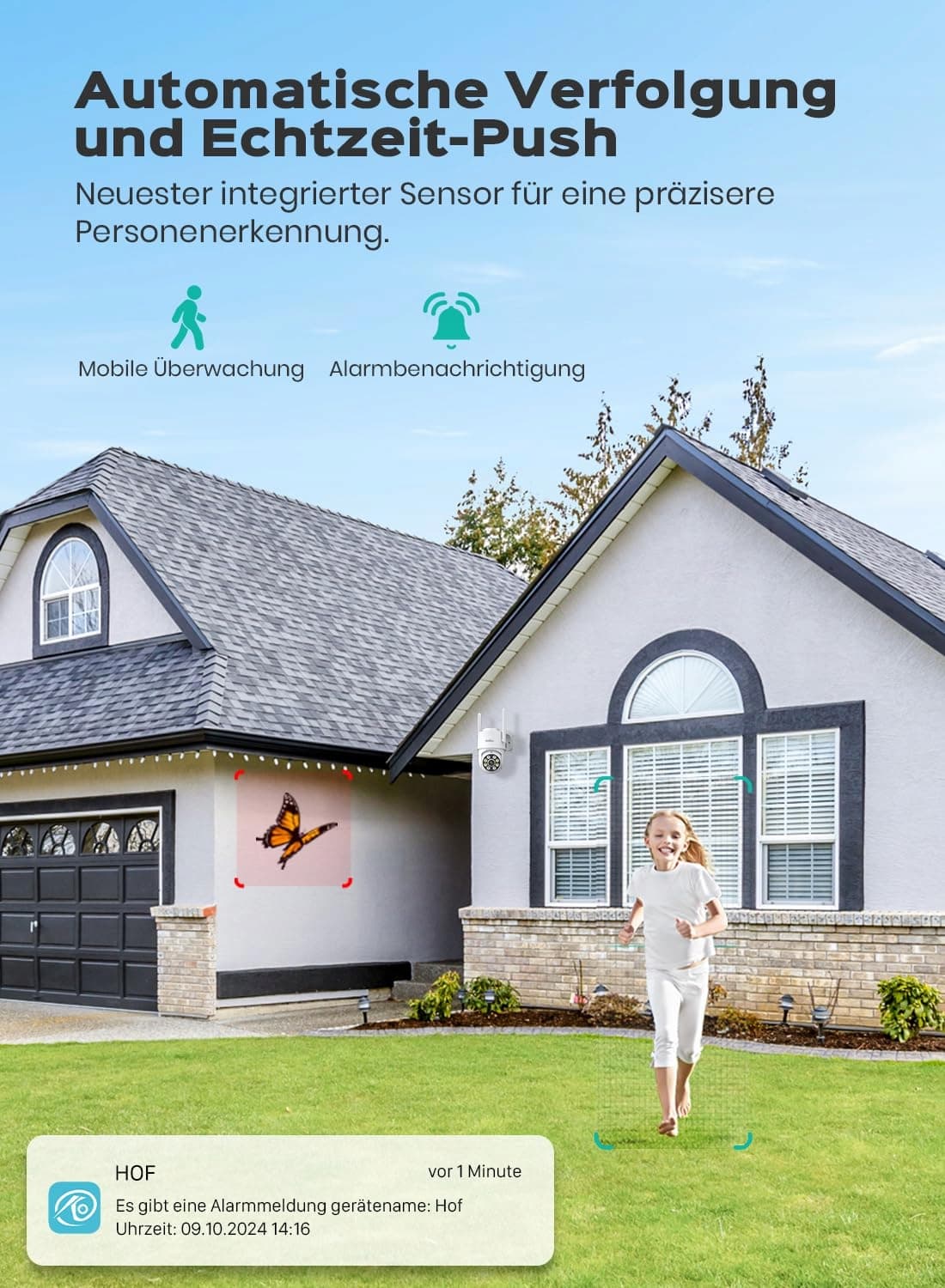 Wykrywanie AI i aktywna ochrona: kamera WiFi na zewnątrz jest wyposażona w syrenę. Gdy kamera monitoringu wykryje ruch, nagrywa alarmowe wideo i powoduje miganie diod LED, towarzyszone sygnałem alarmowym, aby odstraszyć intruzów. Jednocześnie kamera monitoringu wewnątrz wysyła powiadomienie w czasie rzeczywistym na Twój smartfon w ciągu 0,2 sekundy
