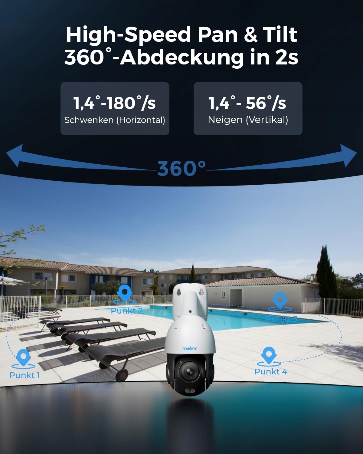360° PAN & 90° TILT & AUTOMATYCZNE ŚLEDZENIE: Ciesz się szerokim kątem widzenia z RLC-823S1. Dzięki funkcjom obrotu 360° i nachylenia 90°, kamera automatycznie śledzi poruszające się cele z każdej strony. (Regulowana prędkość obrotu: 1,4°- 180°/s; nachylenie: 1,4°- 56°/s).