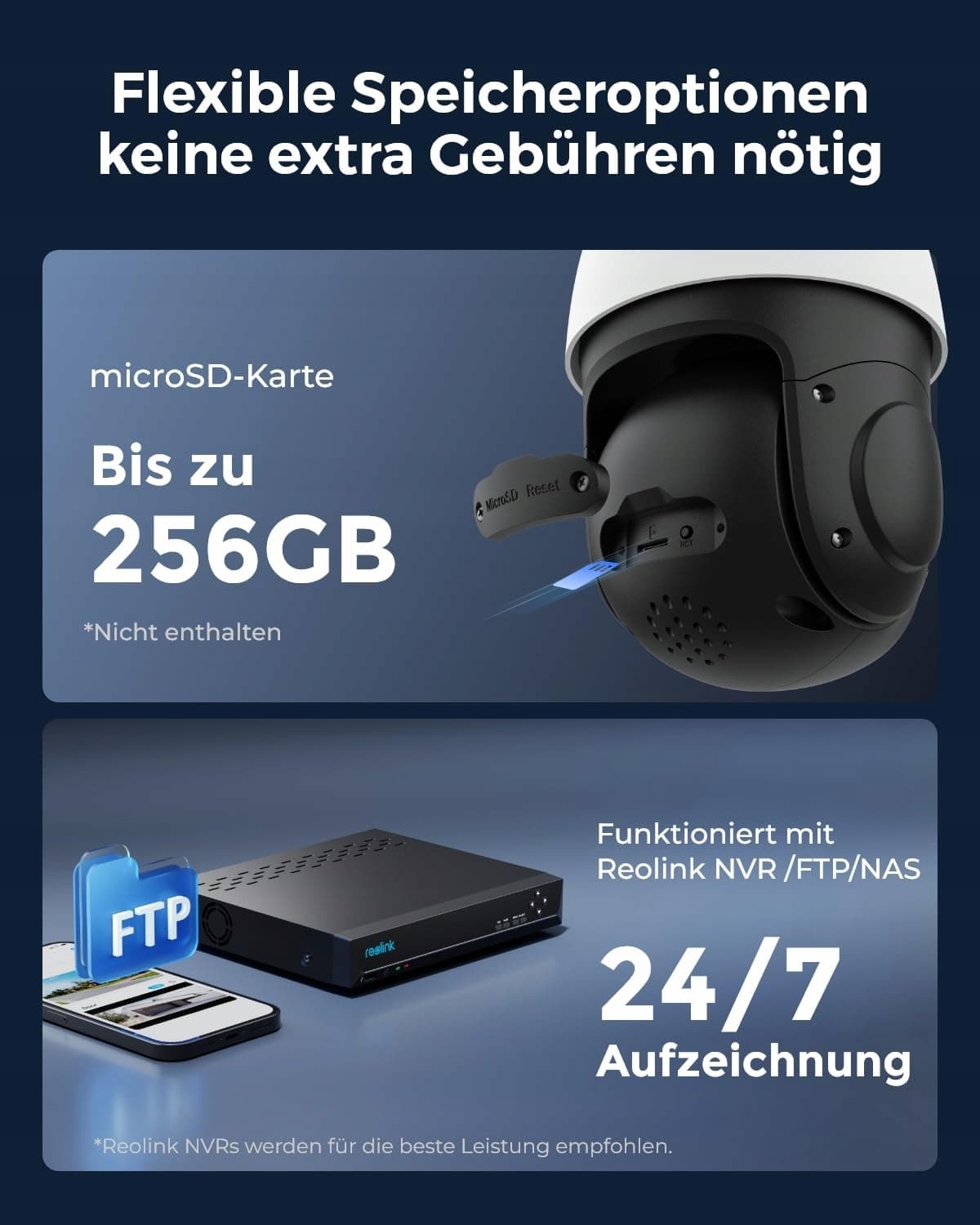 ŁATWA INSTALACJA PoE I ELASTYCZNE OPCJE NAGRYWANIA: Dzięki technologii Power-over-Ethernet (PoE) ta kamera PTZ-IP może przesyłać wideo i ładować się za pomocą tylko jednego kabla sieciowego. Opcje przechowywania: karta microSD (maks. 256GB, nie w zestawie), Reolink NVR lub serwer FTP.