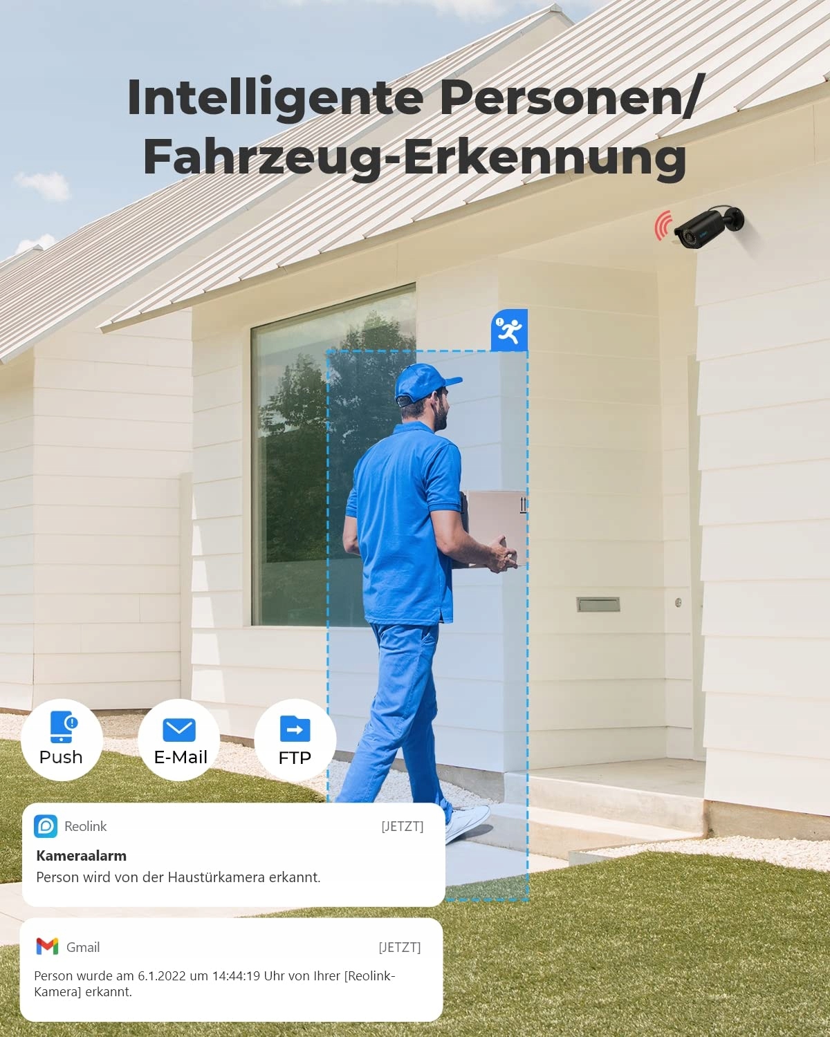 ROZPOZNAWANIE LUDZI I POJAZDÓW Z INTELIGENTNYMI ALARMAMI: Ta kamera IP PoE potrafi rozpoznawać osoby i pojazdy na podstawie ich kształtu, co minimalizuje niepotrzebne alarmy, takie jak zwierzęta czy cienie. Może również wskazać rodzaj wykrycia, gdy wysyła do Ciebie alarmy ruchu. Wystarczy rzut oka na ekran telefonu, aby wiedzieć, co się stało