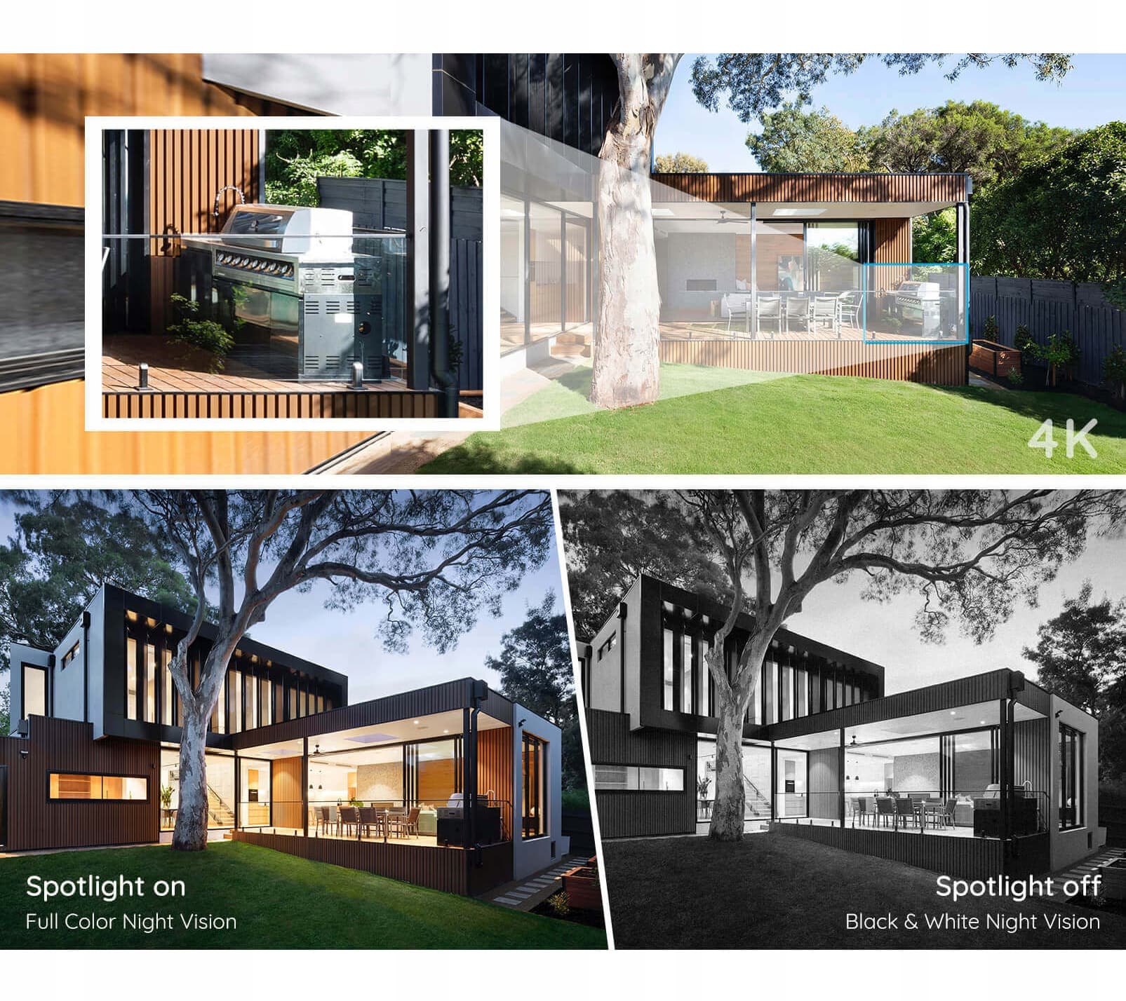 Kolorowy tryb nocny z reflektorami: Ta zewnętrzna kamera 4K umożliwia uzyskanie wyraźnych obrazów z żywymi kolorami podczas transmisji na żywo i odtwarzania. Gdy nie ma już światła dziennego, kamera PoE 811A nadal nagrywa w pełnym kolorze dzięki wbudowanym reflektorom. To dostarcza więcej szczegółów wizualnych, które pomagają w identyfikacji osób i pojazdów, niż czarno-białe wideo