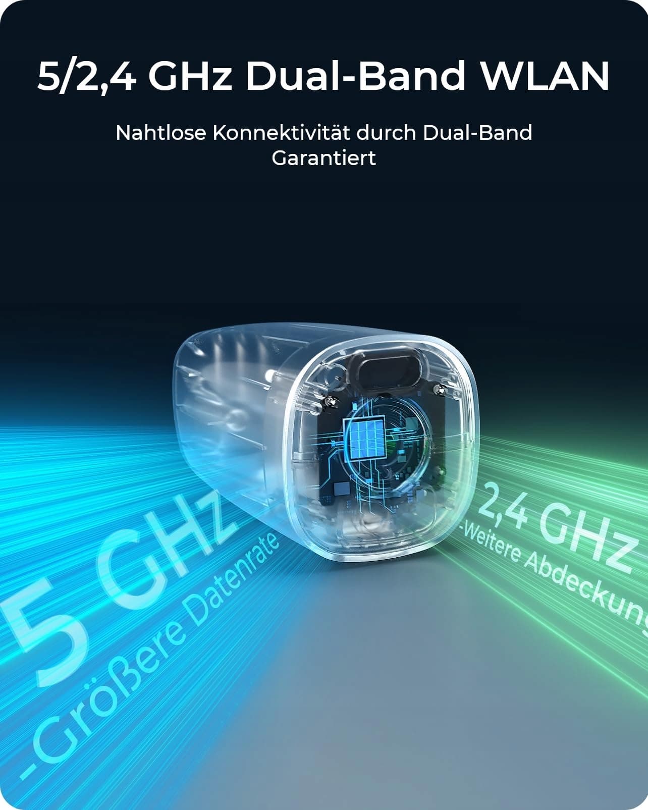 2,4/5GHz ŁĄCZNOŚĆ WLAN: Ta kamera Solar WLAN obsługuje zarówno WiFi 2,4GHz, jak i 5GHz. Wybierz 2,4GHz dla stabilniejszego połączenia lub WiFi 5GHz dla szybszej prędkości. Zdecyduj w zależności od miejsca instalacji kamery, które pasmo WLAN będzie najodpowiedniejsze.