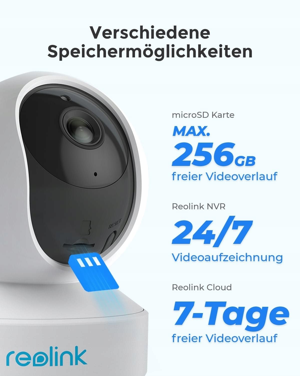 Elastyczne opcje przechowywania: Filmy można zapisywać na karcie microSD (do 256 GB, nie w zestawie) oraz na rejestratorze NVR Reolink lub przesyłać do chmury Reolink.