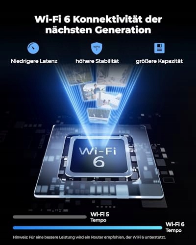 Doświadczenie Wi-Fi 6: Ta zewnętrzna kamera do monitoringu oferuje kompatybilność z WiFi 6, co oznacza: niższe opóźnienia, wyższe prędkości i zwiększone bezpieczeństwo cybernetyczne, które spełniają rosnące wymagania dzisiejszych użytkowników.