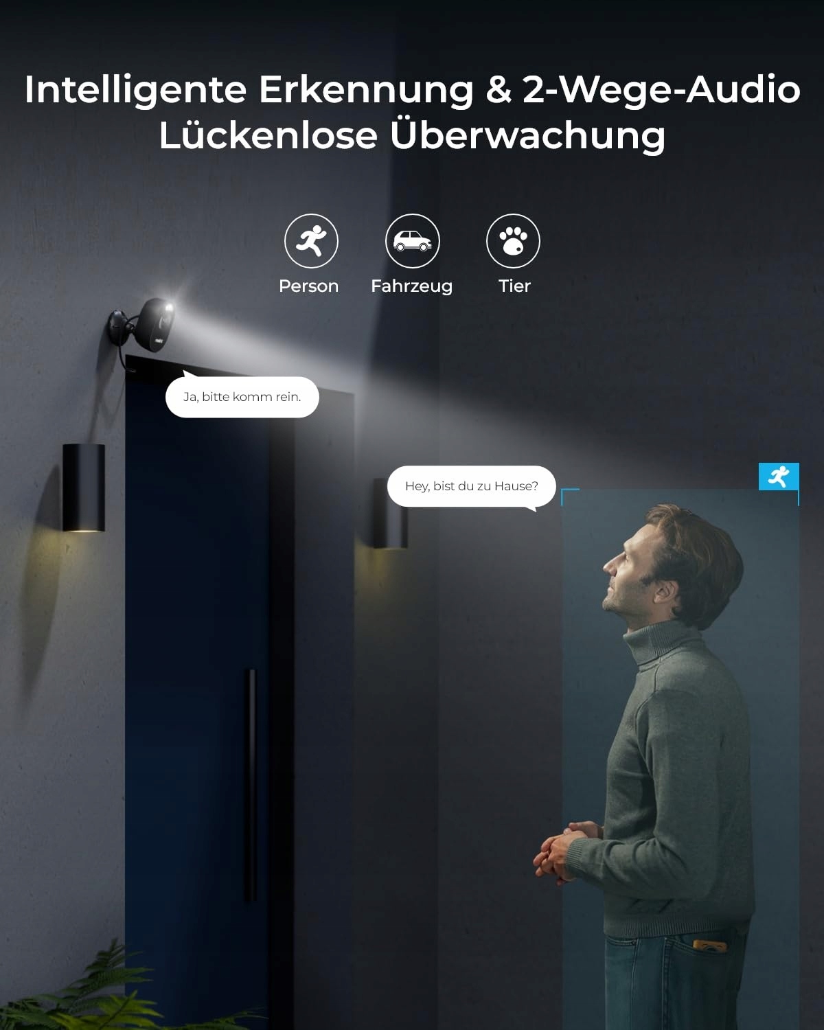 INTELIGENTNE ROZPOZNAWANIE AI: Kamera Wlan na zewnątrz teraz posiada inteligentne funkcje rozpoznawania osób, pojazdów i zwierząt, co czyni ją wszechstronnym i proaktywnym rozwiązaniem bezpieczeństwa, które minimalizuje fałszywe alarmy spowodowane nieistotnymi wyzwalaczami ruchu.