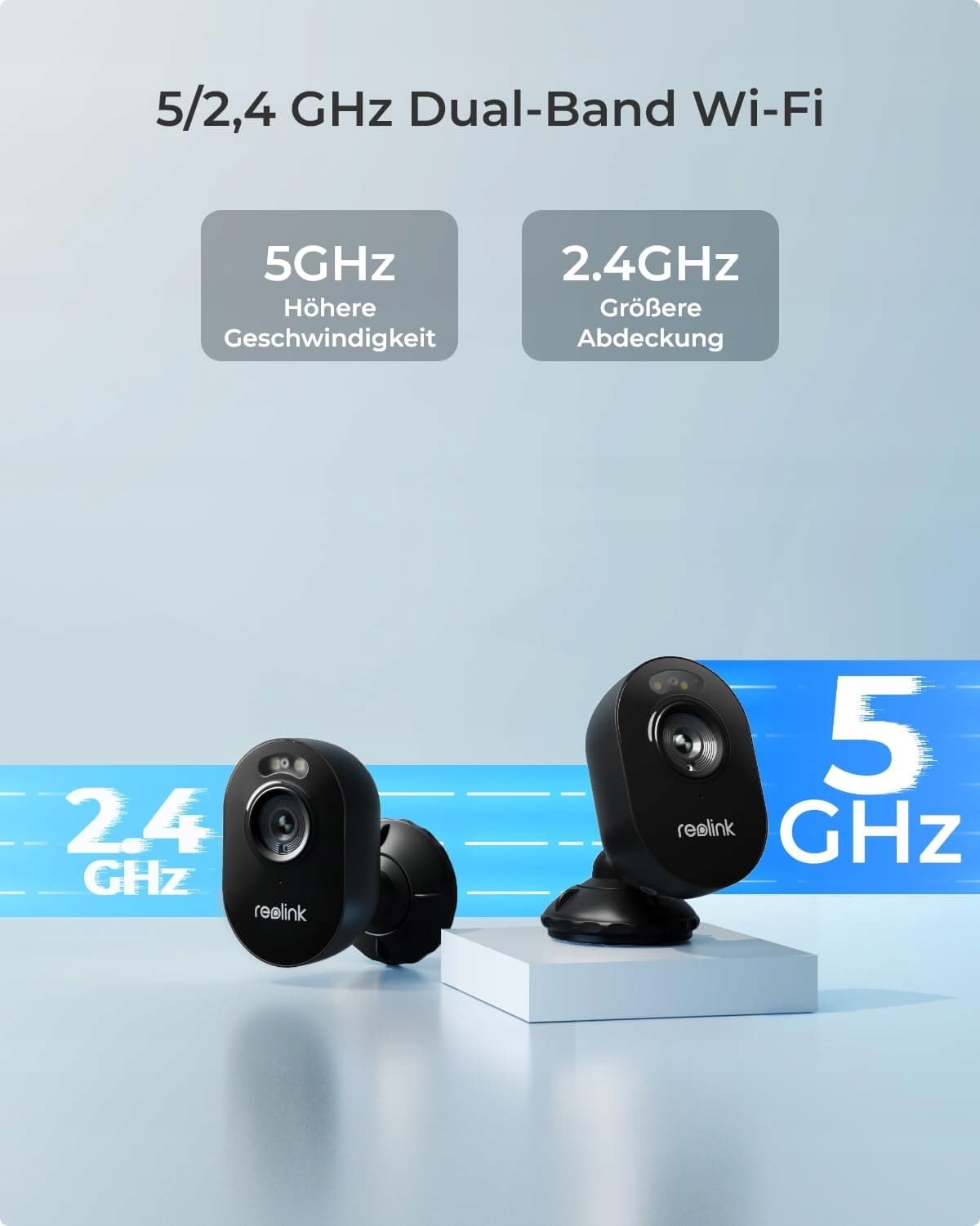 DUAL-BAND WIFI KOMPATYBILNOŚĆ: Zaktualizowany Reolink Lumus obsługuje teraz pasmo WLAN 2,4 GHz i 5 GHz, co zapewnia użytkownikowi rozszerzone opcje łączności, co skutkuje stabilniejszym i niezawodnym połączeniem, umożliwiającym płynne transmisje na żywo i zdalny dostęp do materiałów wideo.
