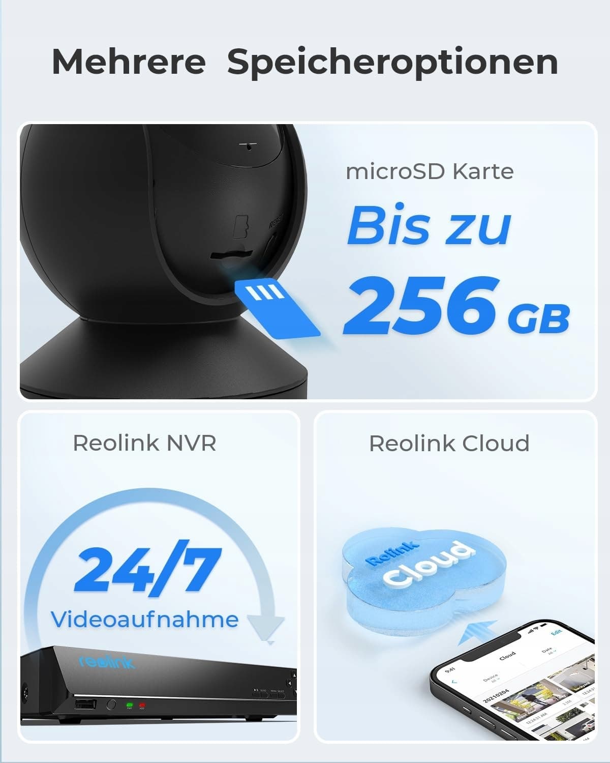Opcje lokalnego i online przechowywania: Nagrania wideo mogą być przechowywane na karcie microSD (maks. 128 GB) oraz na rejestratorze NVR Reolink lub w chmurze Reolink. Karta SD i NVR nie są dołączone.