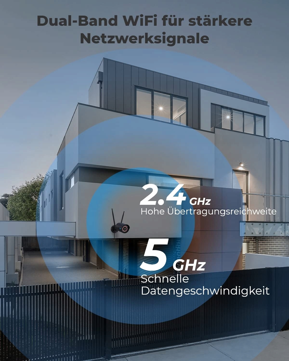 5/2,4 GHz Dualband-WLAN: Kamera obsługuje Dualband-WLAN dla optymalnej wydajności sieci. 2,4 GHz obejmuje większy obszar, podczas gdy 5 GHz zapewnia mniej zakłóceń. Wybierz odpowiednie pasmo w zależności od otoczenia.
