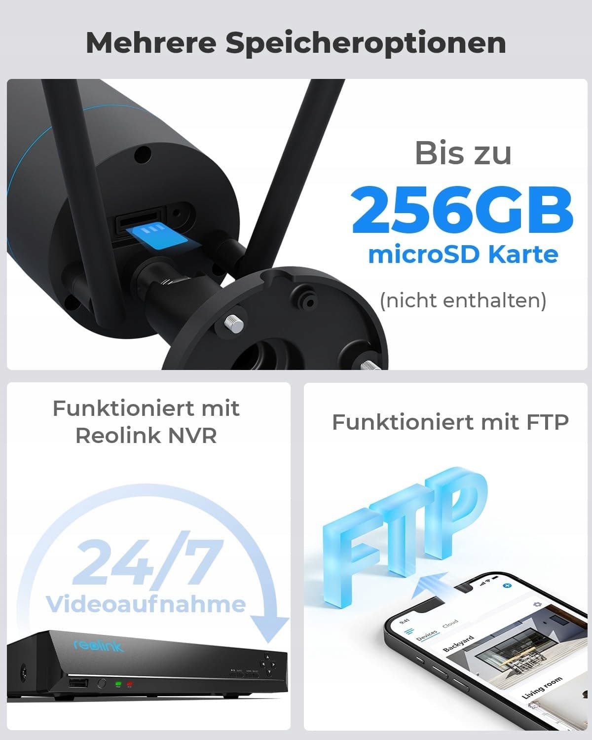 Wiele Opcji Przechowywania: Wybierz preferowaną metodę przechowywania nagrań. Karta microSD (do 256 GB, nie dołączona), Reolink NVR (z najnowszą wersją oprogramowania) lub serwer FTP - masz wybór.