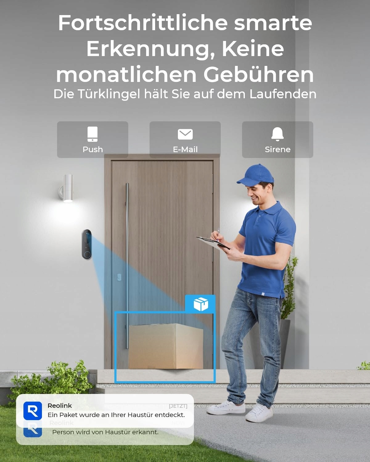 INTELIGENTNE WYKRYWANIE + WIDEOPOŁĄCZENIE + SZYBKA ODPOWIEDŹ: Dzięki naszej inteligentnej funkcji wykrywania jesteś zawsze o krok do przodu i zostaniesz powiadomiony o obecności osób, pojazdów lub paczek. Komunikuj się w czasie rzeczywistym z odwiedzającymi poprzez wideopołączenia lub nagrane szybkie odpowiedzi - i to wszystko bez opłat miesięcznych!