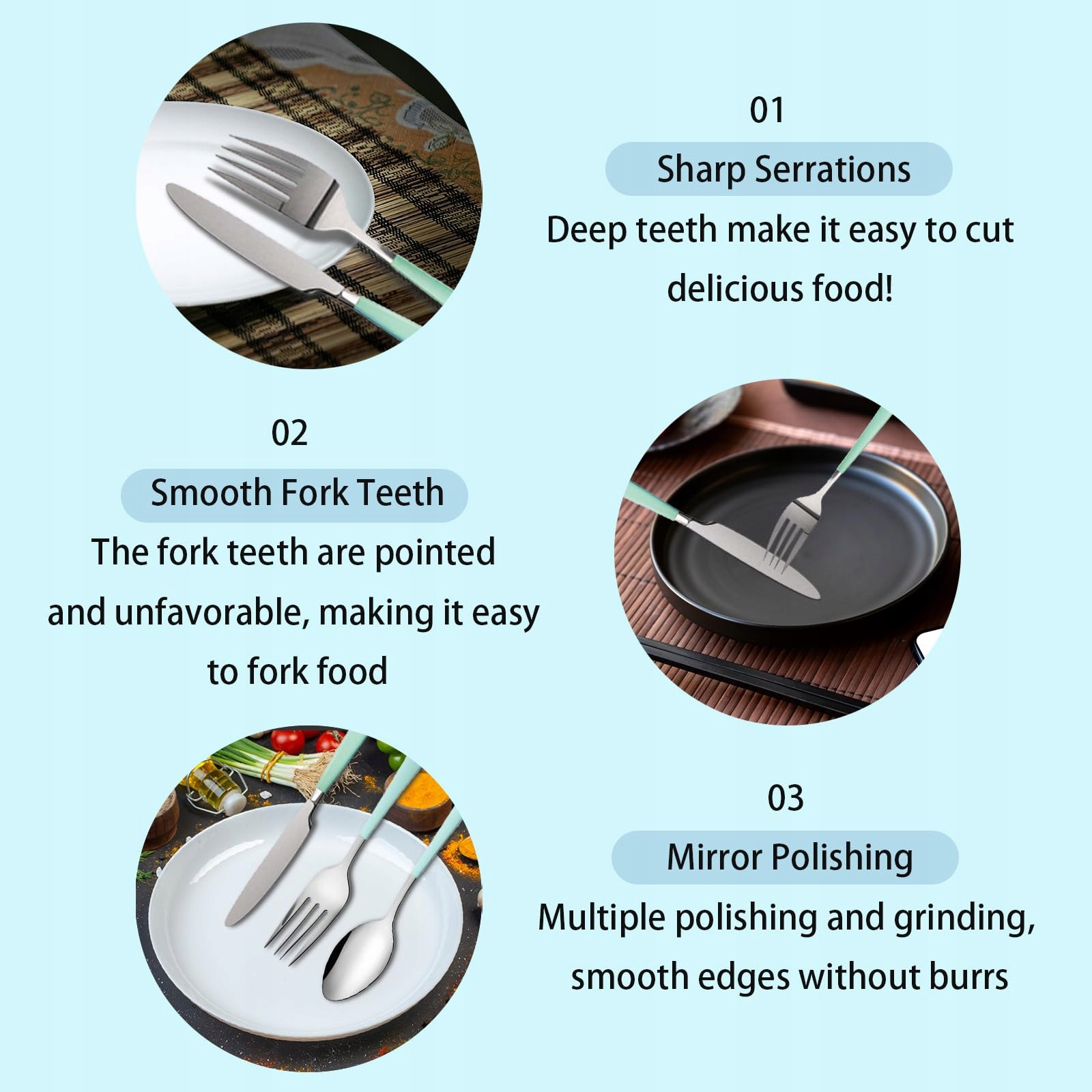 【Polerowanie na lustro】: Zestaw sztućców został poddany obróbce polerskiej, z gładkimi krawędziami i bez szorstkich miejsc. Polerowanie na lustro utrzymuje te naczynia błyszczące i sprawia, że Twoje otoczenie do jedzenia jest eleganckie i wyjątkowe.