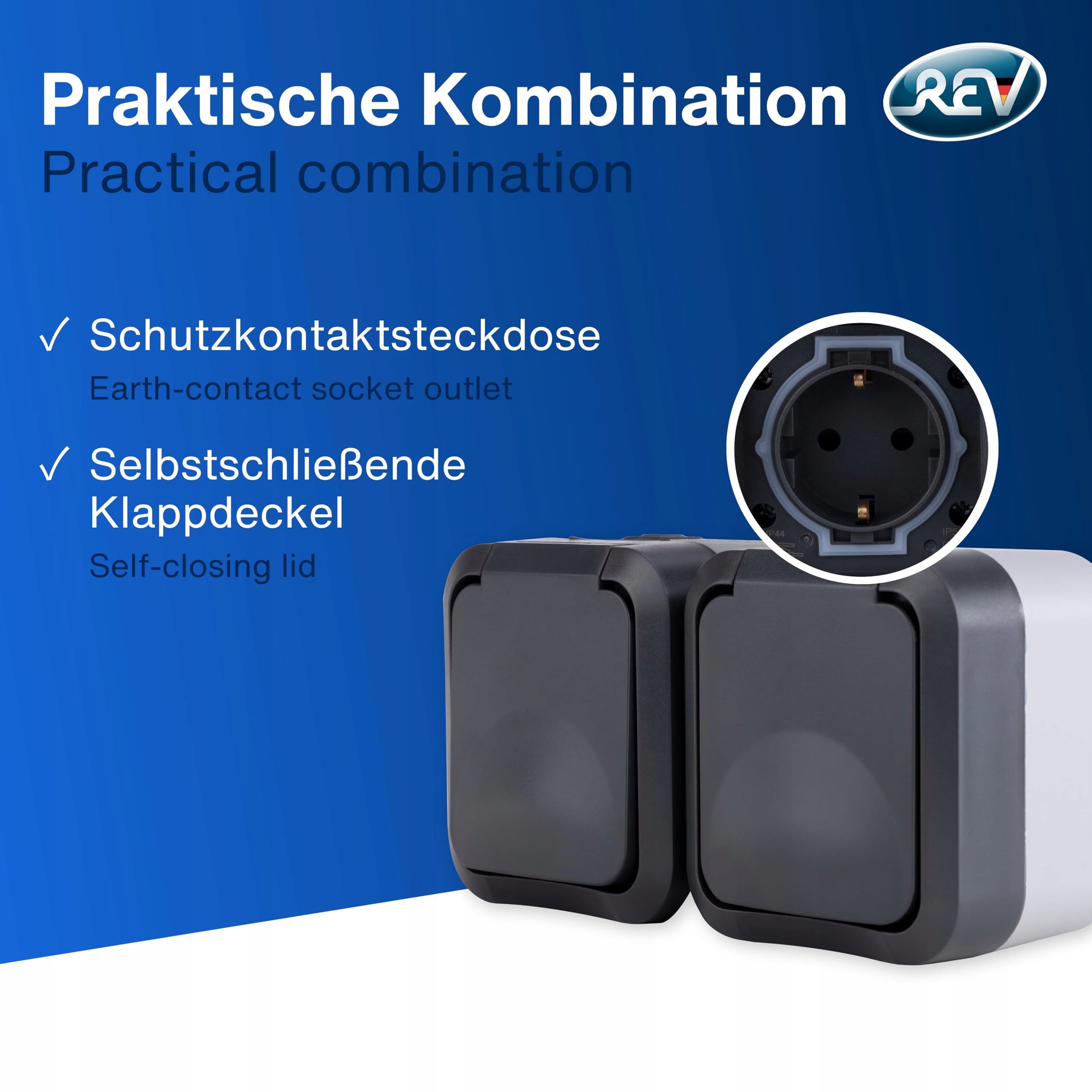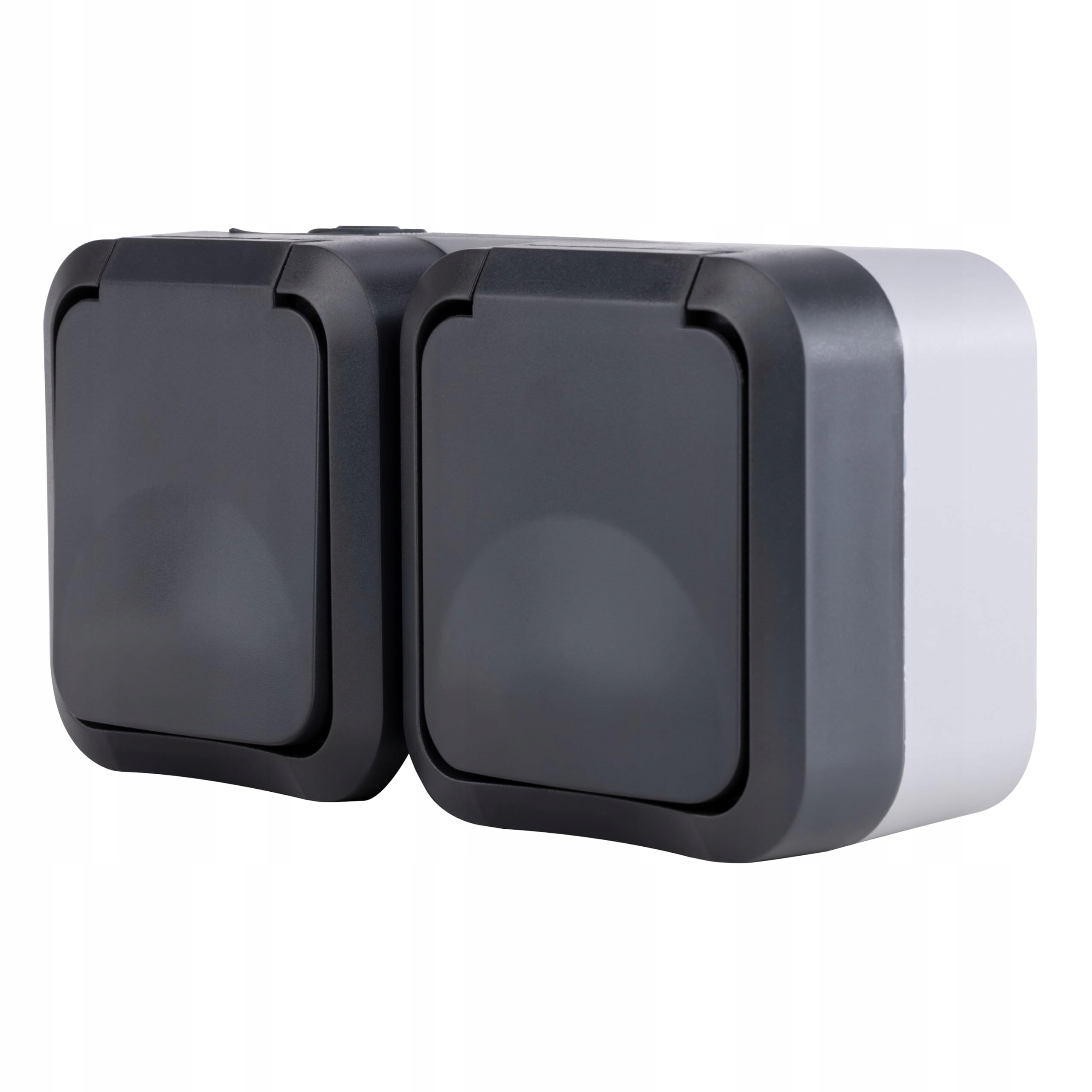 Gniazdo podwójne ma dwa klapki, które chronią przed wilgocią (IP55). Użycie w połączeniu z wtyczkami kątowymi IPx4 na zewnątrz