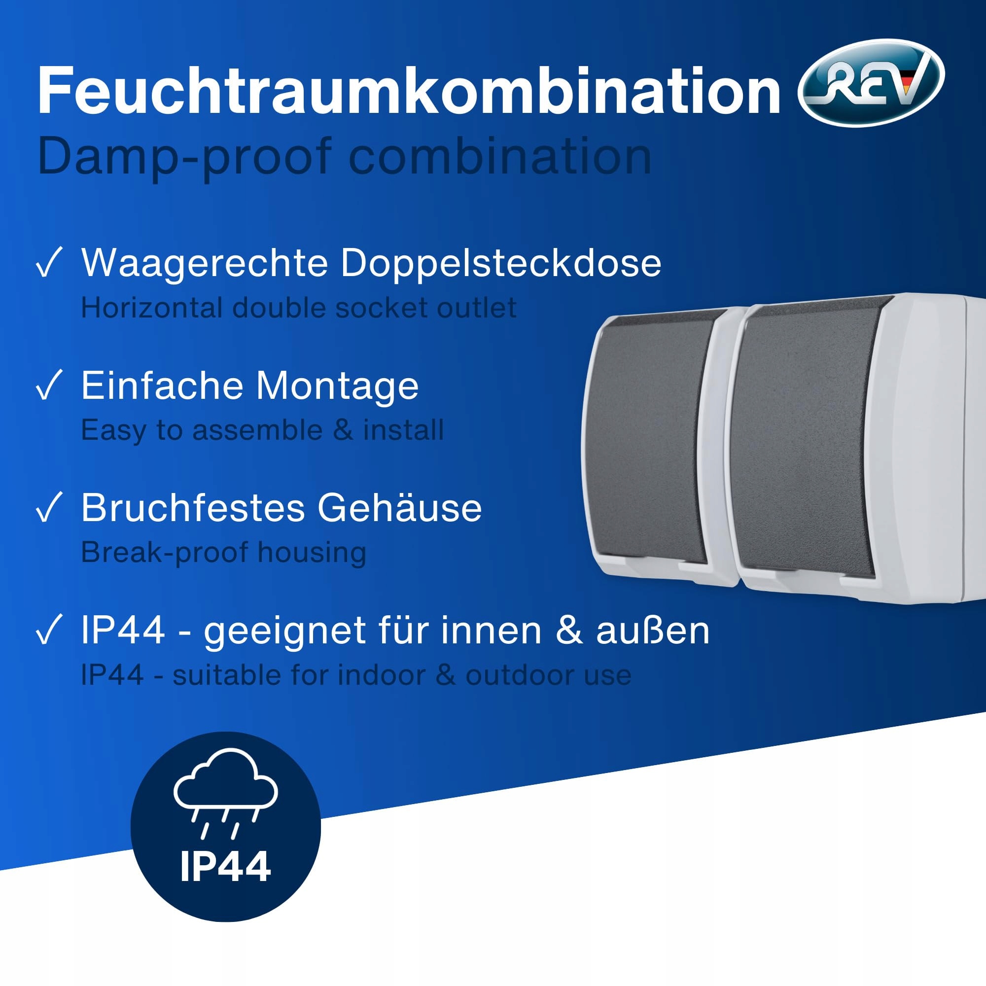 REV AquaForm, podwójne gniazdko - gniazdko do pomieszczeń wilgotnych, IP44, jednopolowe, na powierzchni, szare