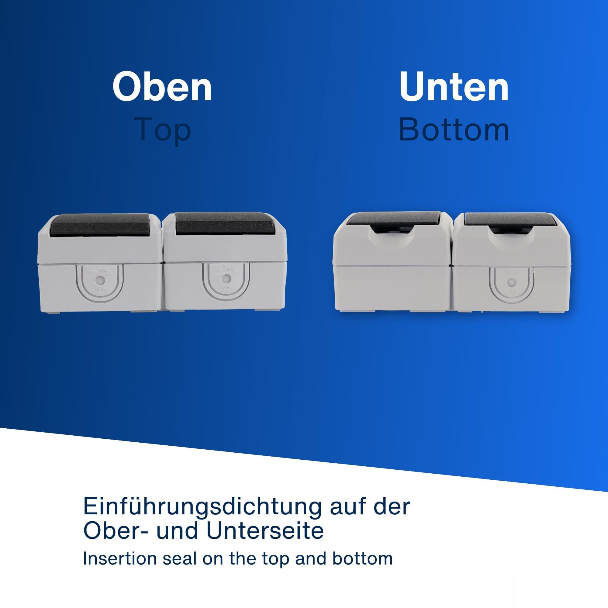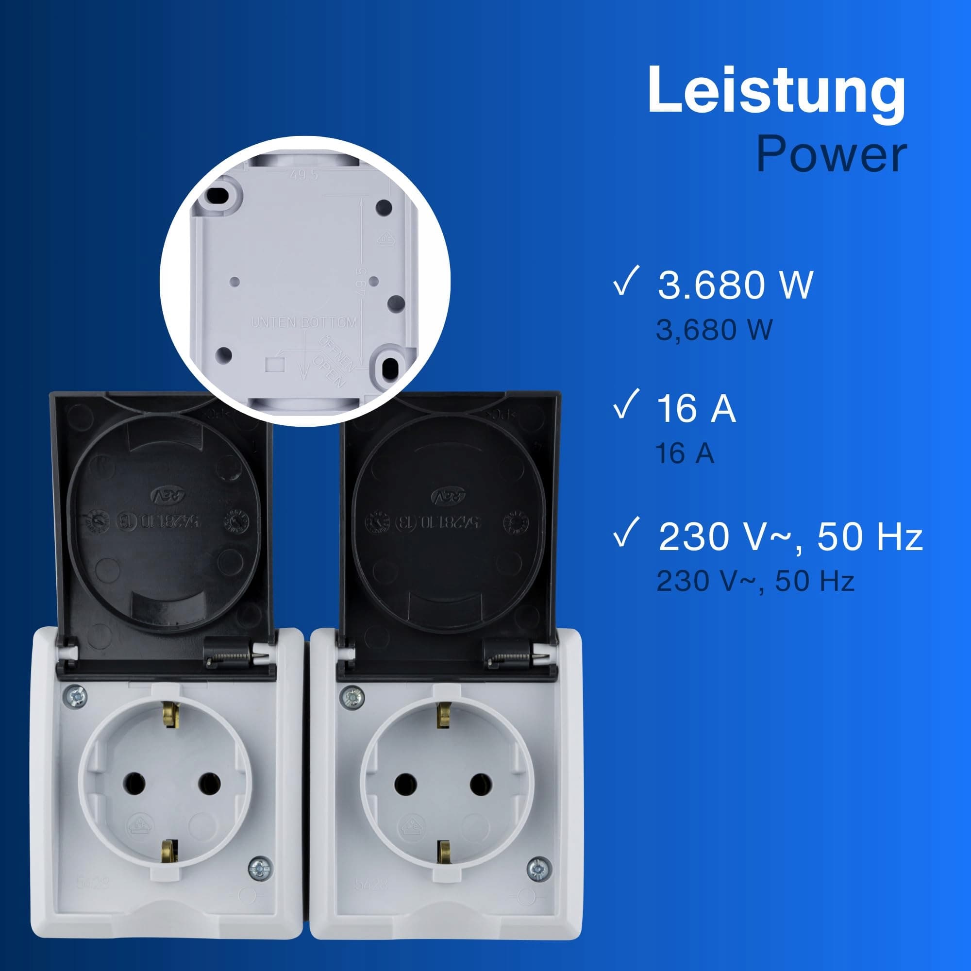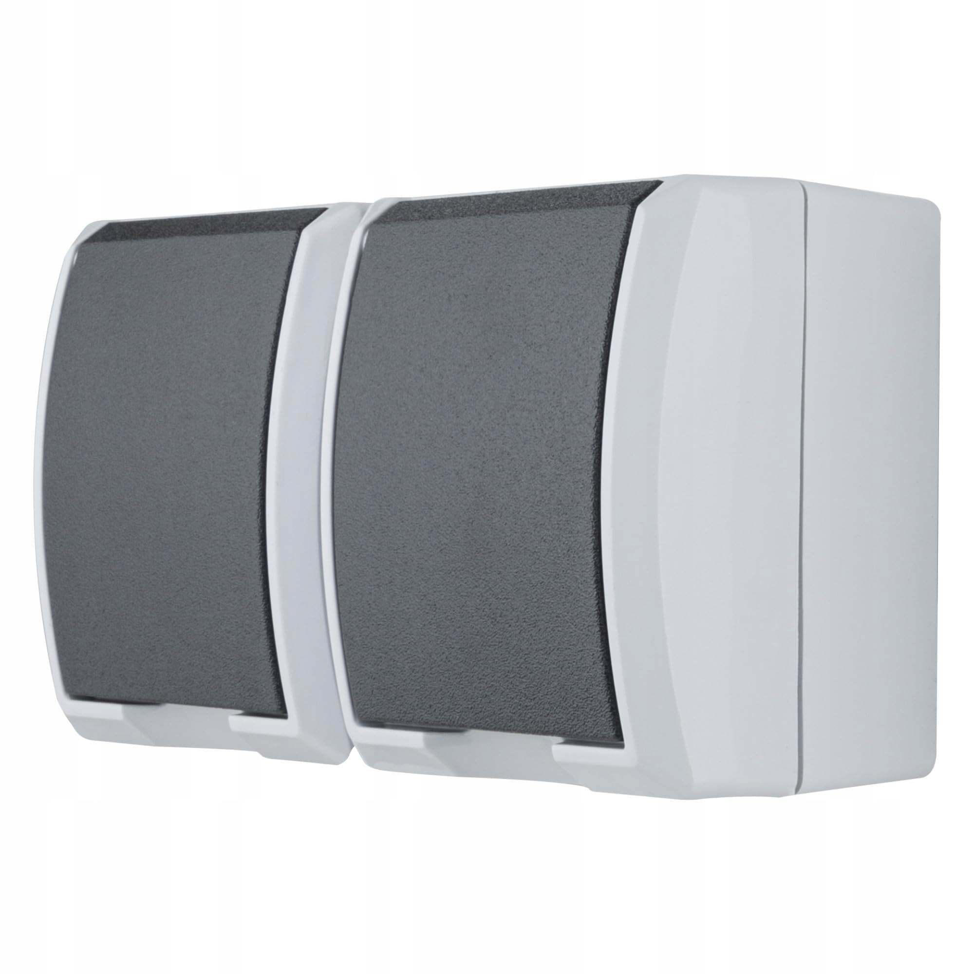Podwójne gniazdko ma dwa ciemnoszare klapki, które chronią przed wilgocią. Doskonałe do użycia z wtyczkami kątowymi IPx4 na zewnątrz