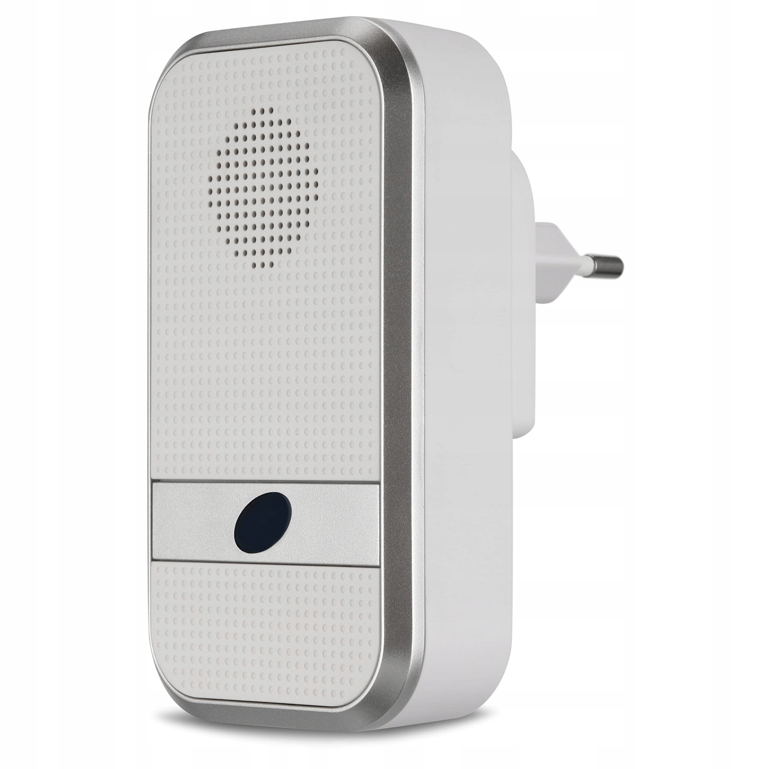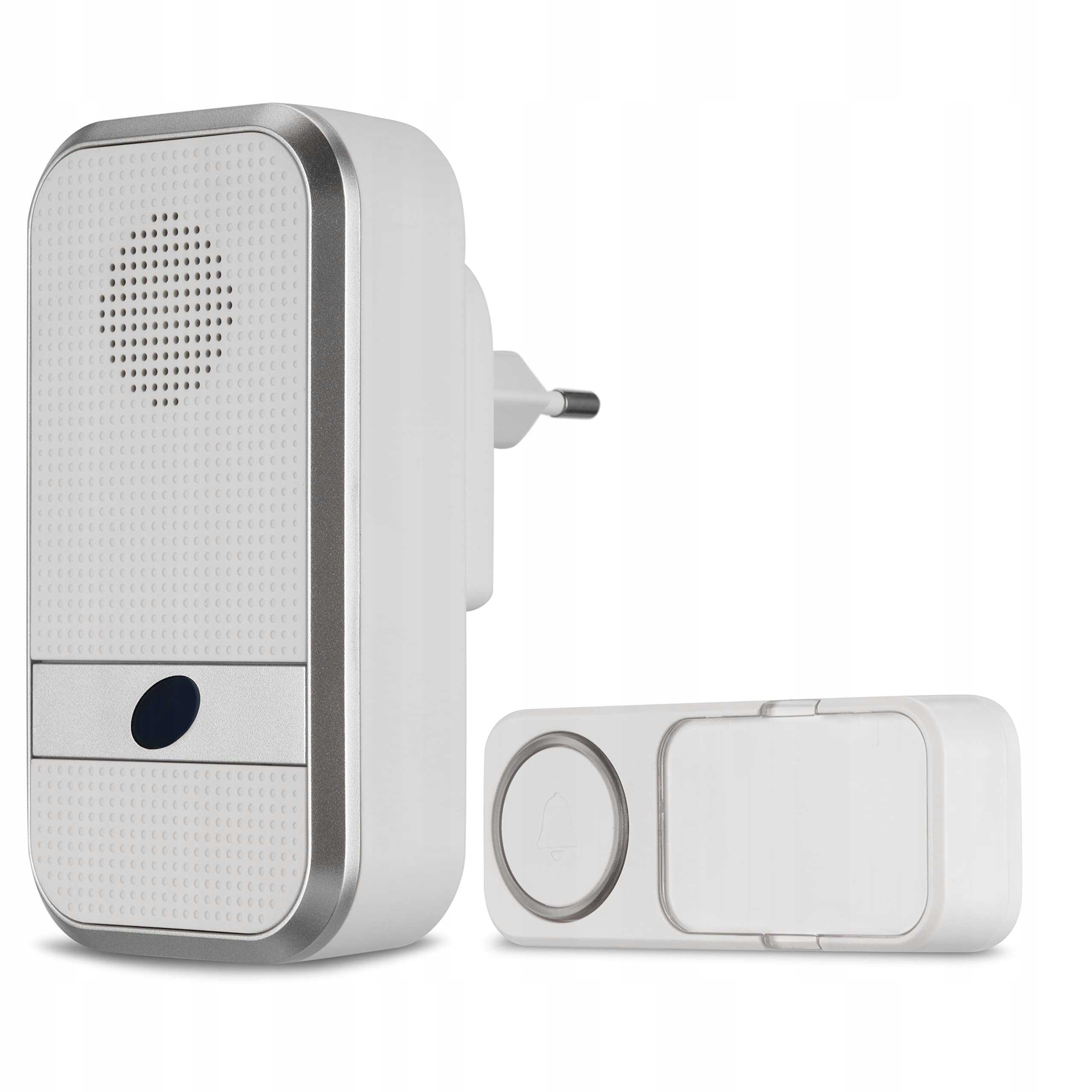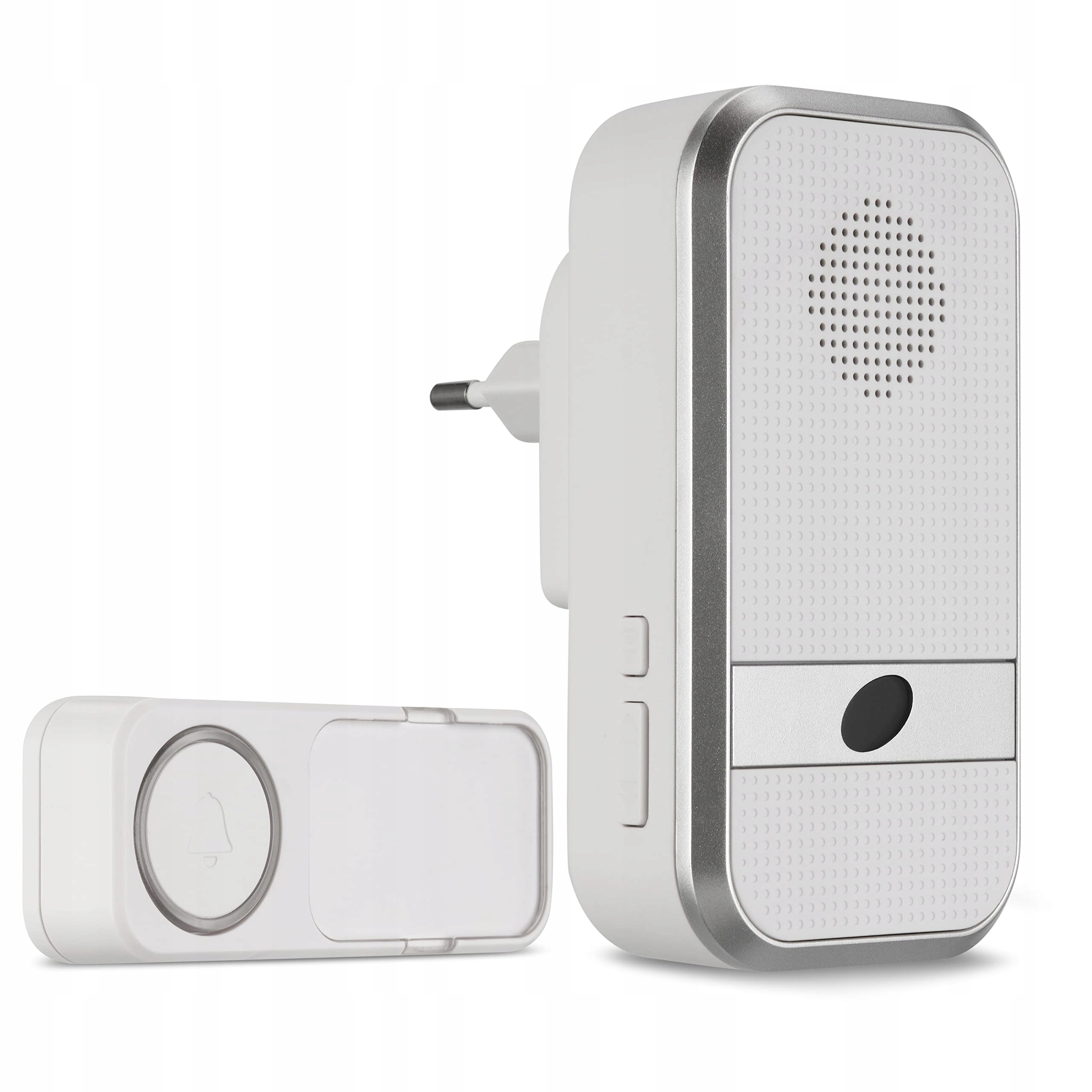 Zestaw bezprzewodowego dzwonka, składający się z dzwonka z wtyczką i przycisku dzwonka. Łatwy do zamontowania dzięki transmisji radiowej. Z kontrolką sygnalizacyjną