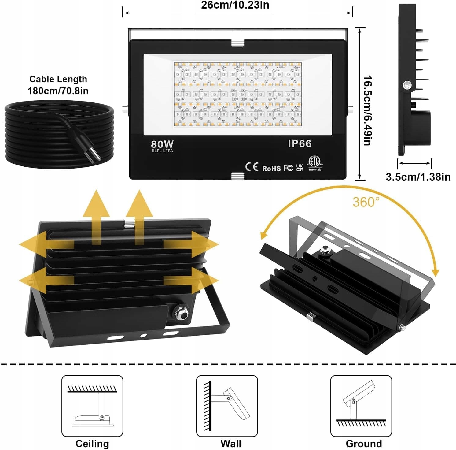 [Wodoodporny naświetlacz IP66] Zewnętrzny naświetlacz z oceną wodoodporności IP66, wykonany z wysokiej jakości odlewu aluminiowego i hartowanego szkła, wystarczająco trwały, aby wytrzymać każdą trudną pogodę, taką jak silny deszcz, deszcz ze śniegiem lub śnieg. To doskonałe oświetlenie zewnętrzne i idealne dekoracyjne oświetlenie do ogrodów, tarasów, werand, podwórek lub podjazdów itd. Wysokiej jakości materiał przewodzący ciepło zapewnia reflektorowi dobrą dystrybucję ciepła i długą żywotność.