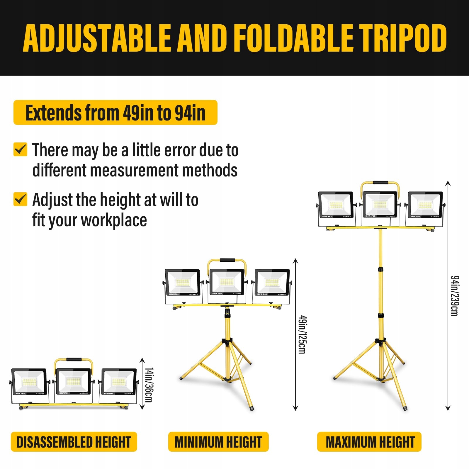 ◑ Trwały materiał: Statyw i obudowa lampy wykonane są ze stopu aluminium, solidne i trwałe, doskonała wydajność odprowadzania ciepła. Zakres wysokości rozkładanego statywu ma 3 regulowane rozmiary: 36cm; 125 cm; 239cm; Zakres wysokości pozwala na wystarczające oświetlenie obszaru, bez przeszkadzających cieni podczas pracy;