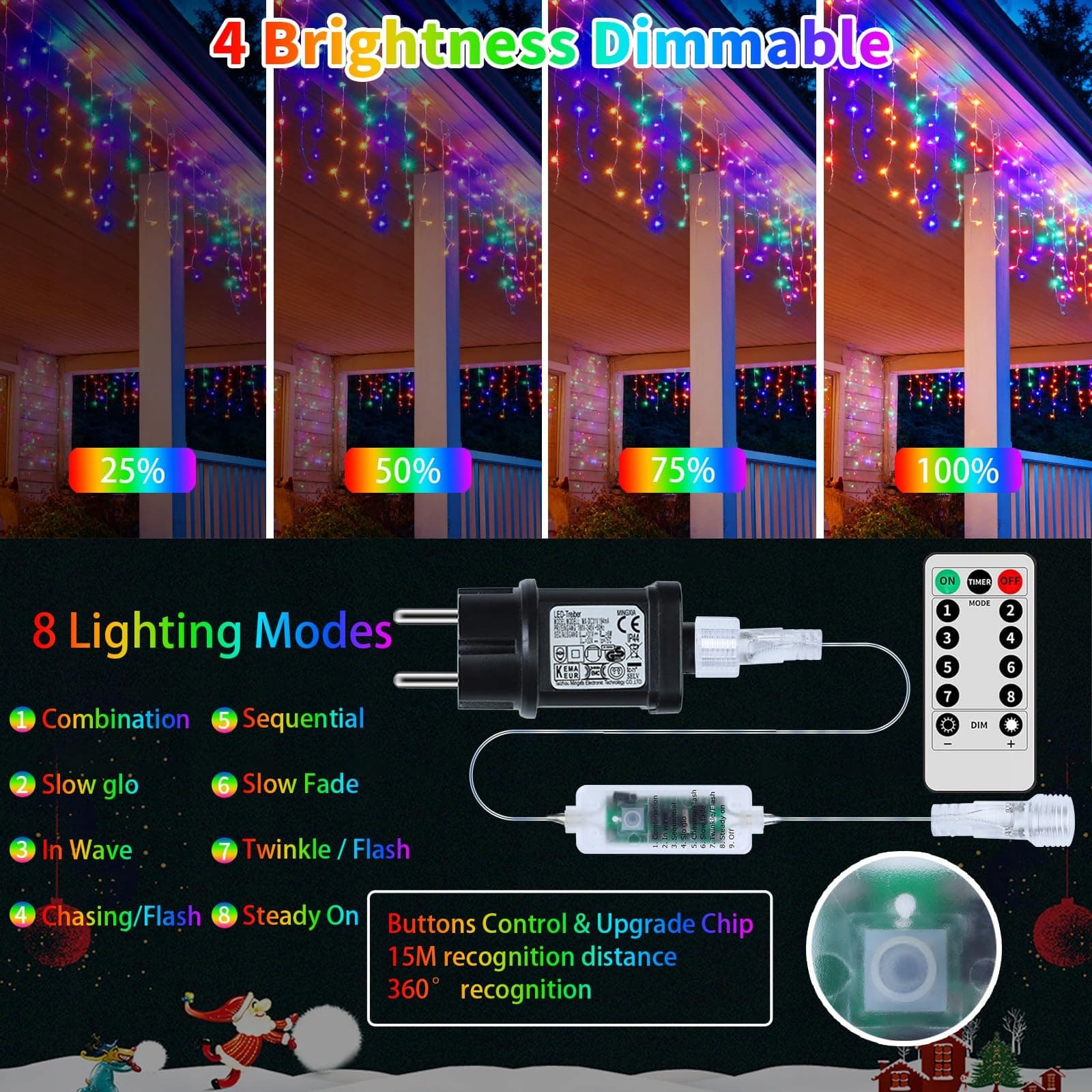 【360° czuły przedłużacz kontrolera】 Zwykły zewnętrzny łańcuch świetlny z efektem lodowego deszczu ma przyciski sterujące na wtyczce, instalacja jest dość skomplikowana, trudna w obsłudze i niebezpieczna, nawet jeśli pilot działa tylko na krótkie, liniowe odległości. Nasze nowe świąteczne światła z efektem sopli lodu RJEDL z wtyczką mają dodatkowe przedłużenie przewodu sterującego, są łatwe w obsłudze i bezpieczne, a pilot działa w zakresie 360°, poprawiając czułość.