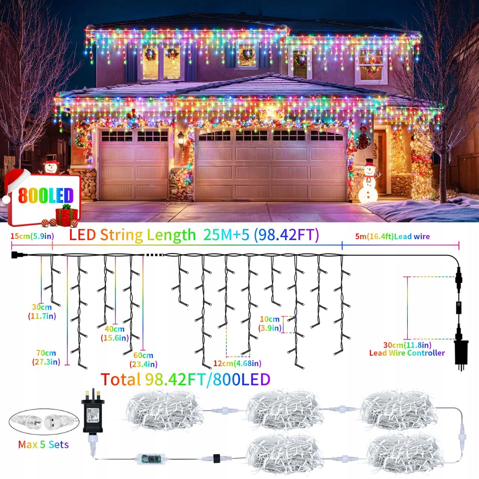 【2025 Nowy model - ulepszony zewnętrzny łańcuch LED】 Zewnętrzny łańcuch świetlny RJEDL z efektem lodowego deszczu ma 3, 7, 4,6 diod LED na każdy zestaw 4 sznurów, łącznie 125 sznurów, 30m (zawiera 25m łańcucha + 5m dodatkowego długiego kabla), 800 diod LED. Można połączyć maksymalnie 5 zestawów łańcuchów do użytku wewnętrznego. Ekstremalnie łatwy w instalacji, szerszy i jaśniejszy. Idealny na Boże Narodzenie, wesela, imprezy i dekoracje ogrodowe!