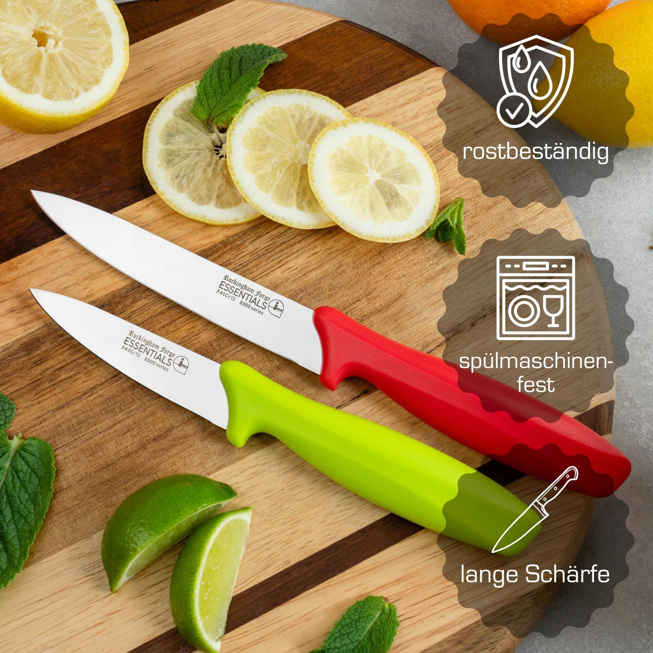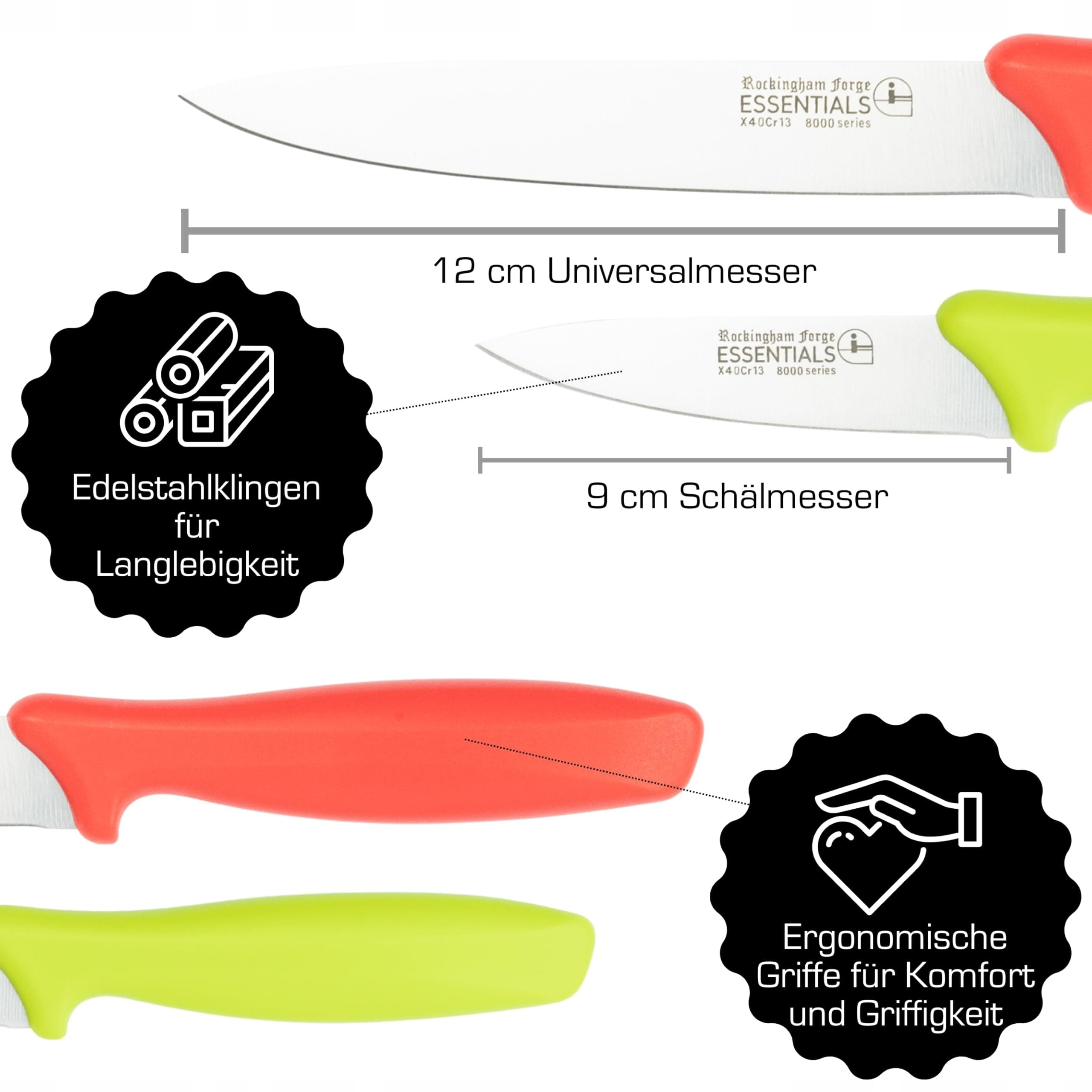 Zestaw noży użytkowych Rockingham Forge 2-częściowy 8007 Essentials, zawiera nóż do warzyw 9 cm i nóż uniwersalny 12 cm, zielone i czerwone uchwyty