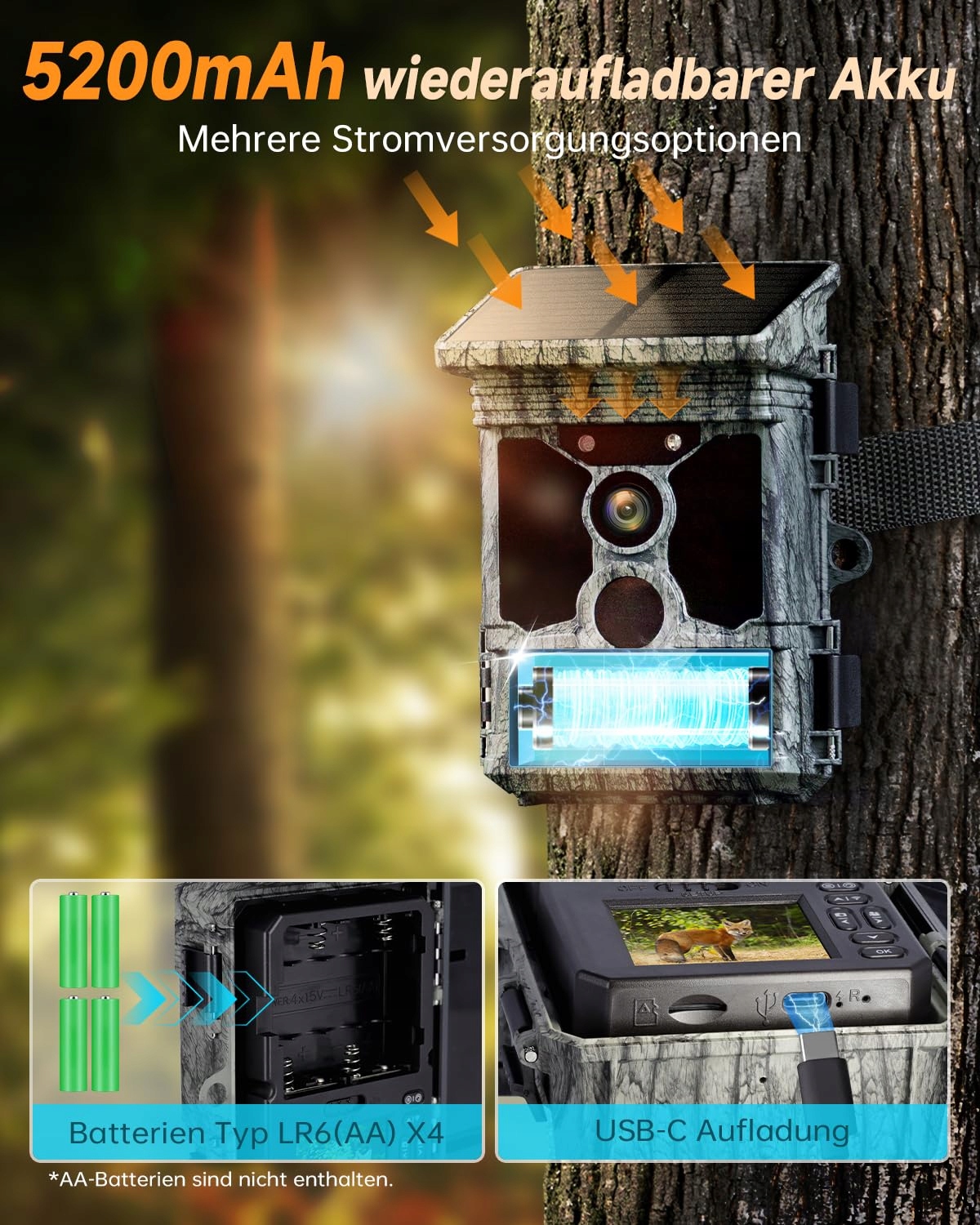 【Kamera leśna zasilana energią słoneczną】Ta kamera leśna zasilana energią słoneczną łączy panel solarny z wbudowanym akumulatorem litowym 5200 mAh, który automatycznie ładuje się energią słoneczną – idealna do stałego użytku na łonie natury. Dodatkowa komora na 4 baterie AA (nie w zestawie) zapewnia zasilanie zapasowe i czyni ją idealną do długotrwałego użycia w odległych miejscach
