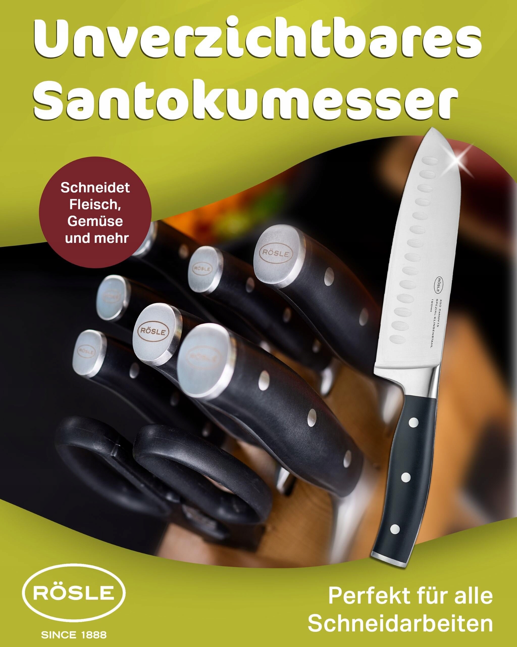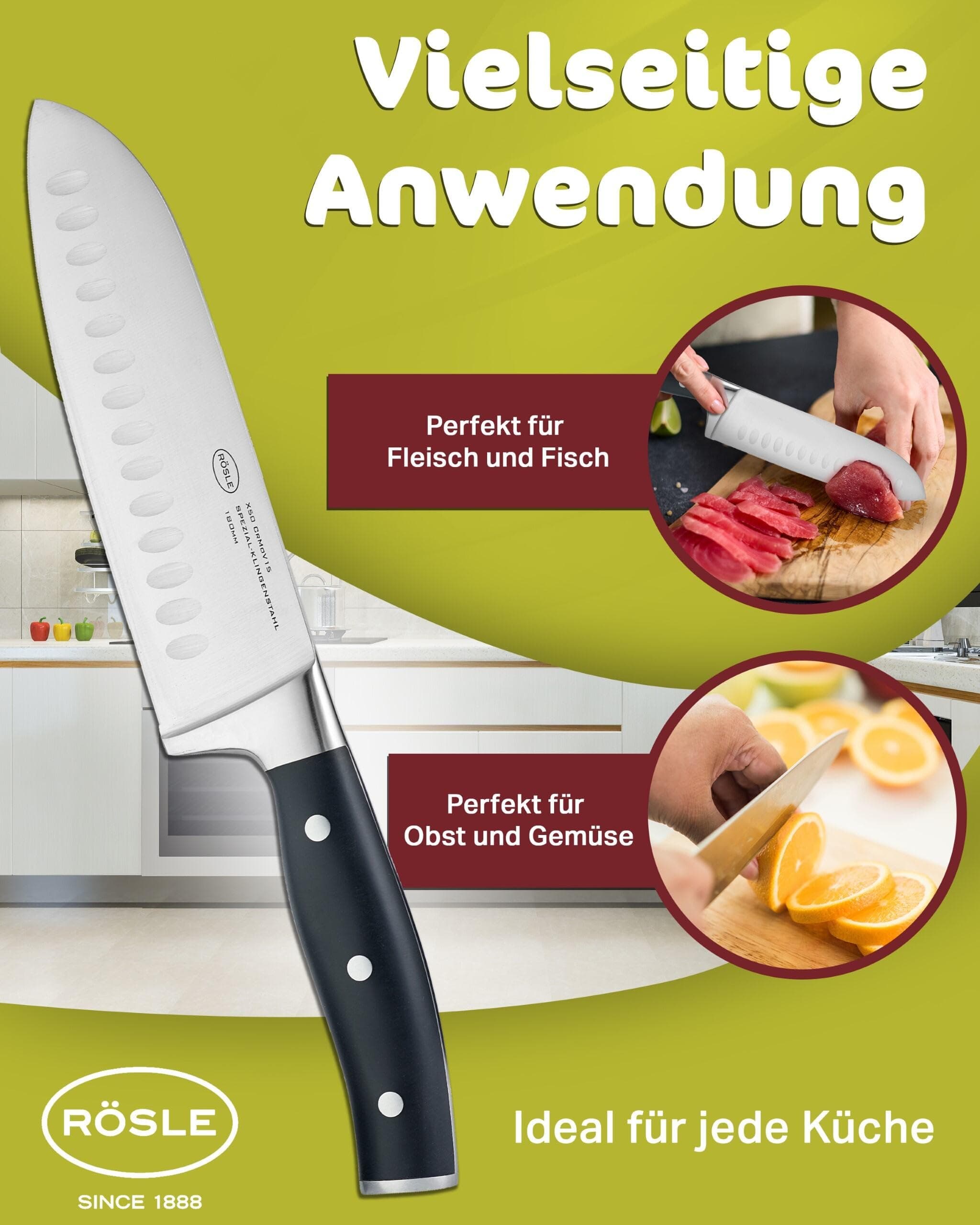 AZJATYCKIE OSTRZE DO PRECYZYJNEGO KROJENIA: Nóż RÖSLE Santoku Tradition z prostym ostrzem o długości 17,5 cm i wgłębieniami jest idealny do drobnego krojenia mięsa, ryb i warzyw. Wgłębienia zapobiegają przyklejaniu się plasterków, co czyni go idealnym nożem do warzyw i mięsa. Wszechstronny i ostry nóż kuchenny do każdej kuchni.