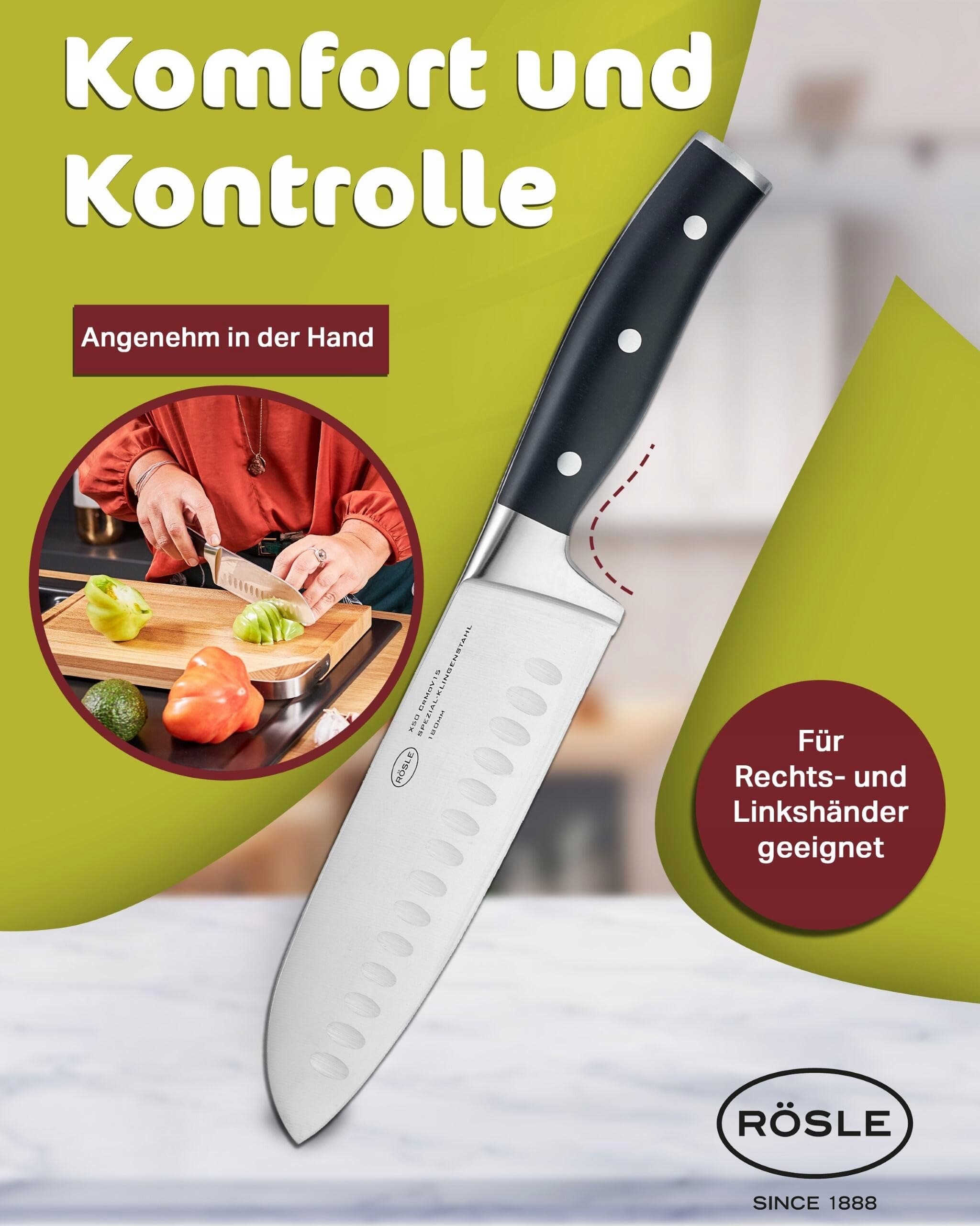 RÖSLE Santokumesser Tradition 17,5 cm - Wysokiej jakości i ostry nóż kuchenny z wgłębieniami, azjatycka forma ostrza, idealny do mięsa, ryb i warzyw, nóż z ergonomicznym uchwytem