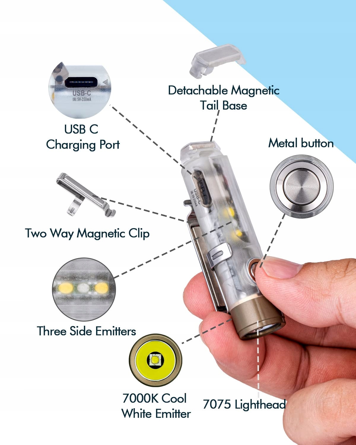 Wszechstronne EDC światło z 4 nadajnikami: Wyposażona w nadajnik przedni do codziennego użytku; Trzy boczne diody – 2 ciepłobiałe, mogą być używane jako światło do czytania lub nocne, dioda LED 365-nm służy tylko do zasilania obudowy GITD Blue