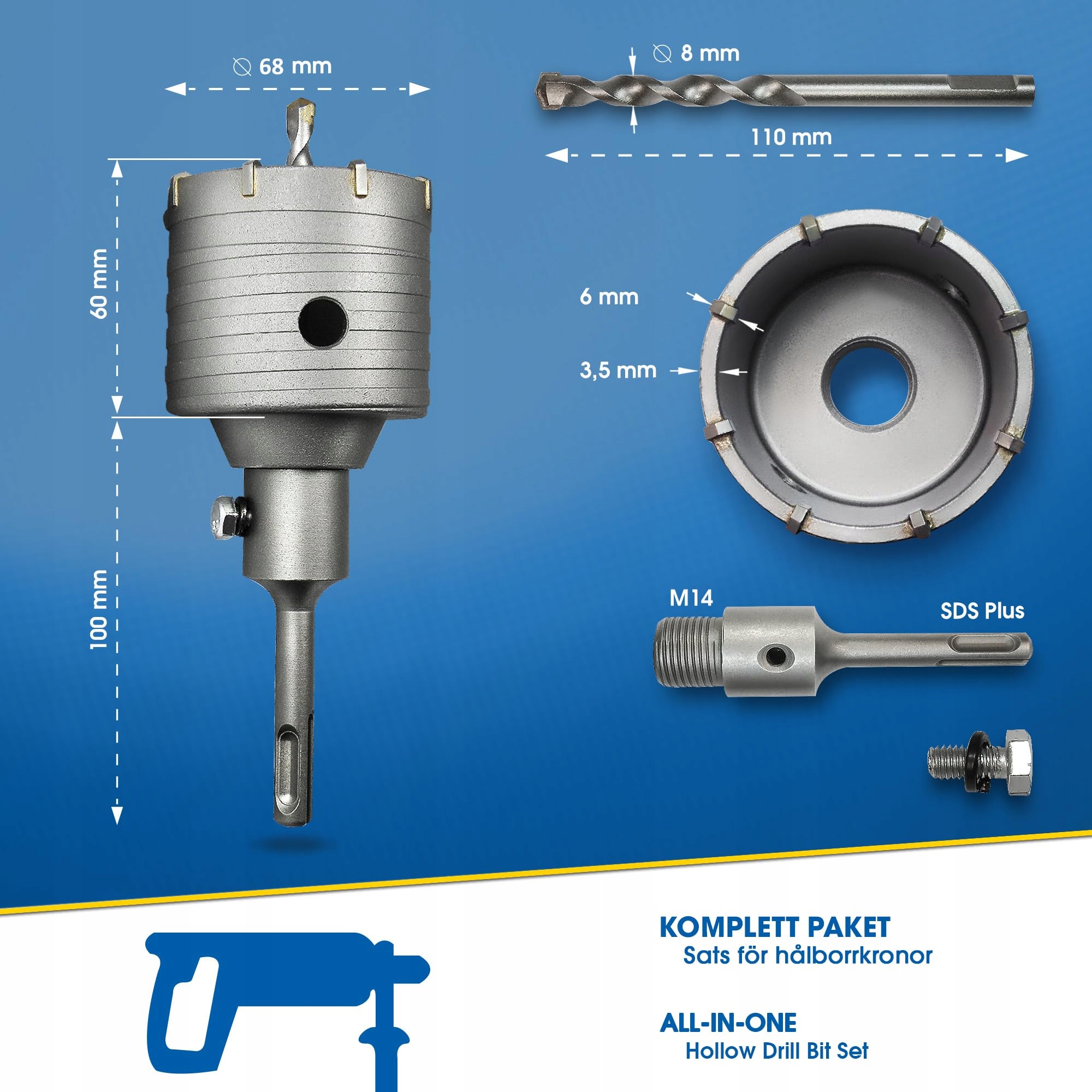 Zestaw: wiertło Hohlbohrkrone - średnica 68 mm, długość robocza 50 mm, całkowita długość 72 mm, adapter SDS plus 110mm (gwint M22), wiertło centrujące 8x110mm